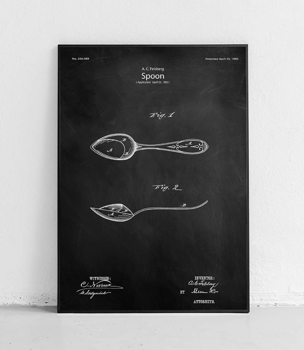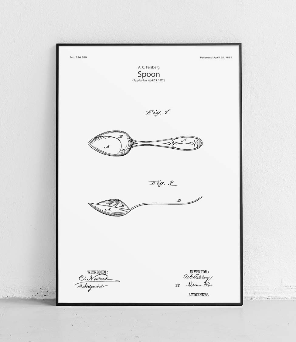 Plakat z reprodukcją patentu łyżki autorstwa Amelia C. Felsberg.