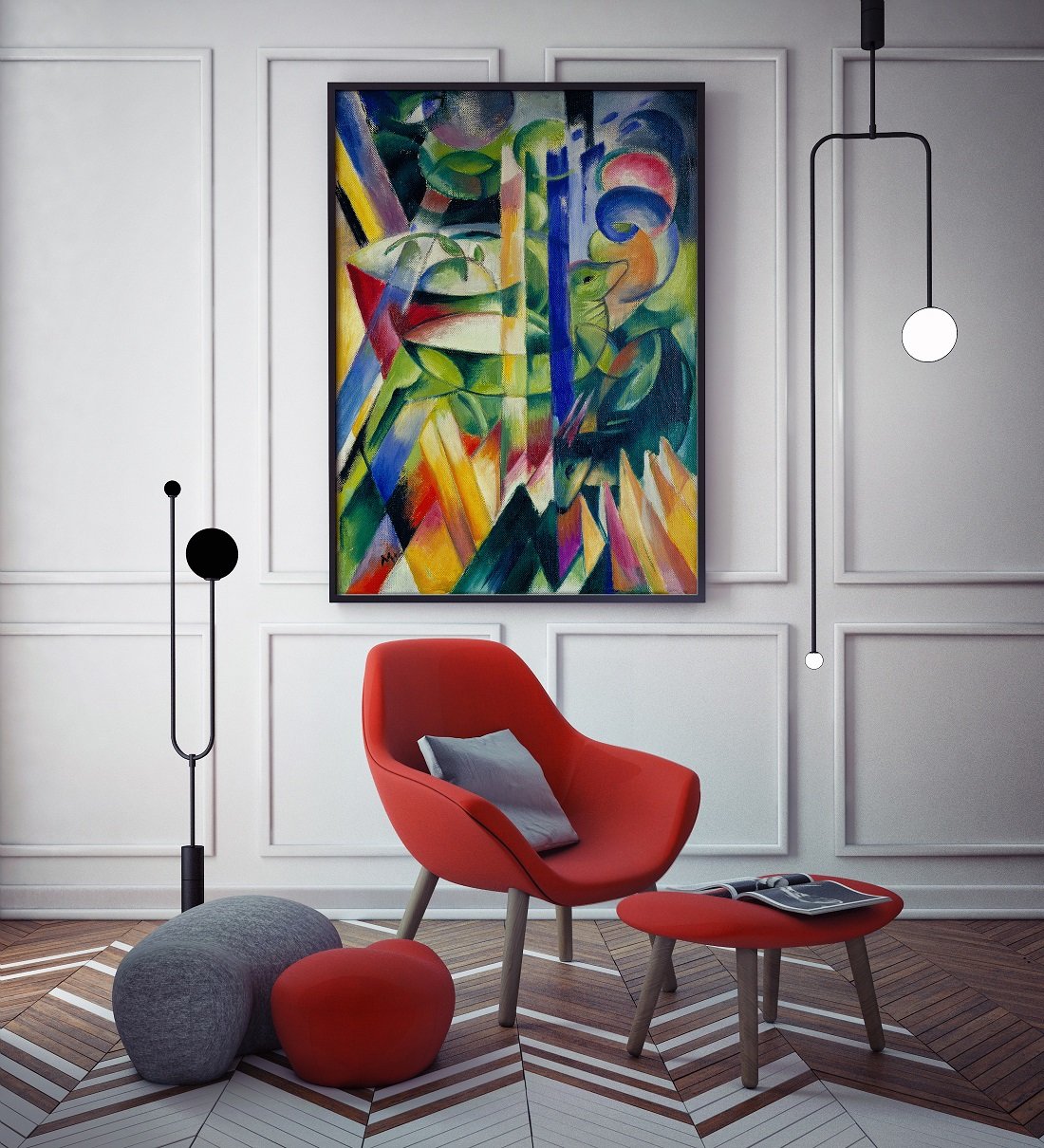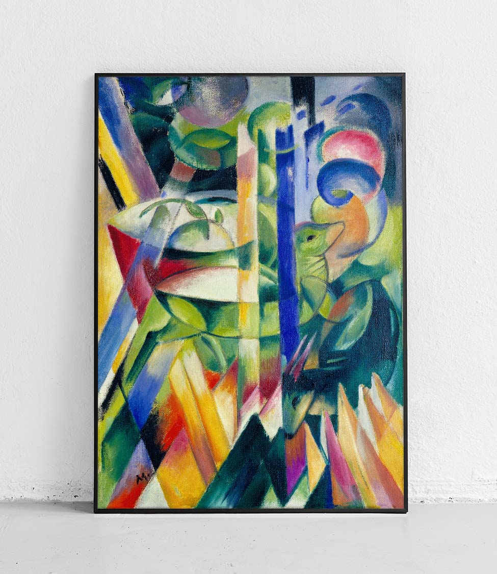 " namalowany w 1913-1914. Na tym uroczym dziele Franza Marca, dwie zielone kozy unoszą się nad krajobrazem kolczastych gór. Oryginał znajduje się obecnie w Saint Louis Art Museum.Jeśli kupisz również ramkę, zajmiemy się oprawą bez dodatkowych kosztów. Twój plakat dotrze już w ramie, gotowy, by zawisnąć na ścianie.