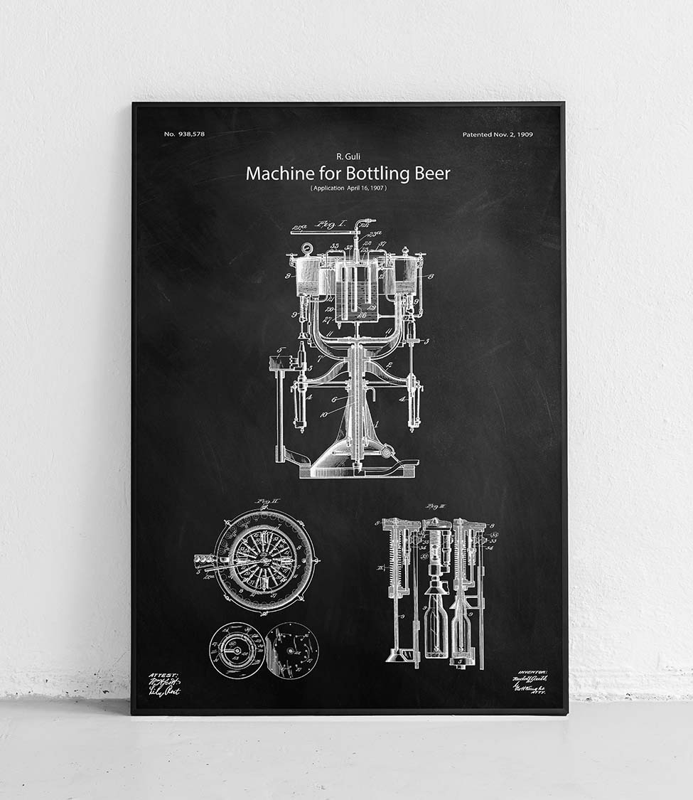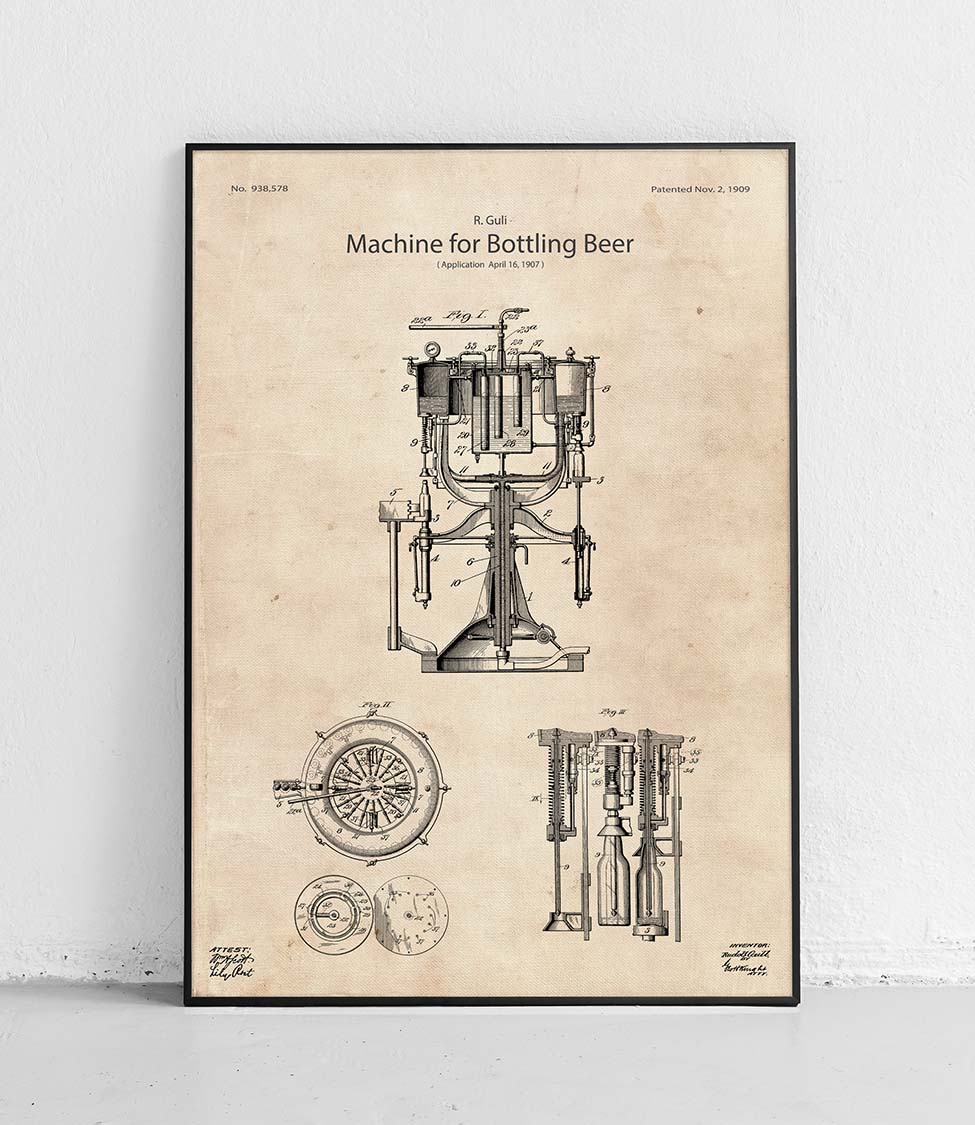 Plakat z reprodukcją patentu przedstawiającego usprawnienia do maszyny do butelkowania piwa autorstwa Rudolf'a Gull.
