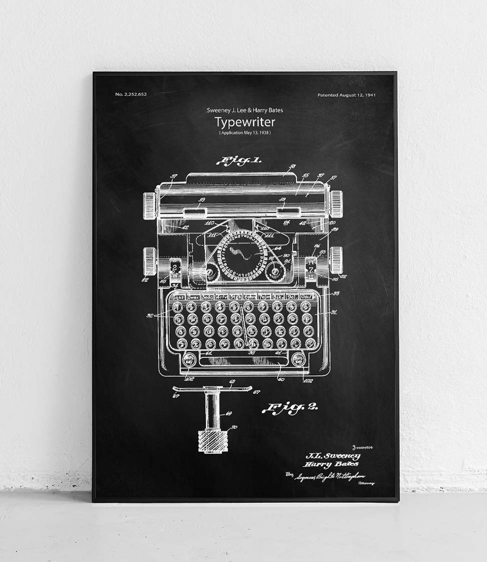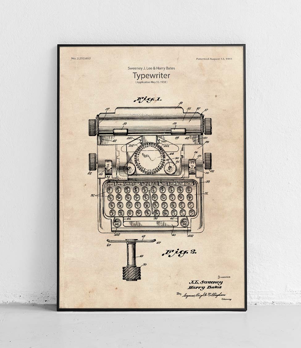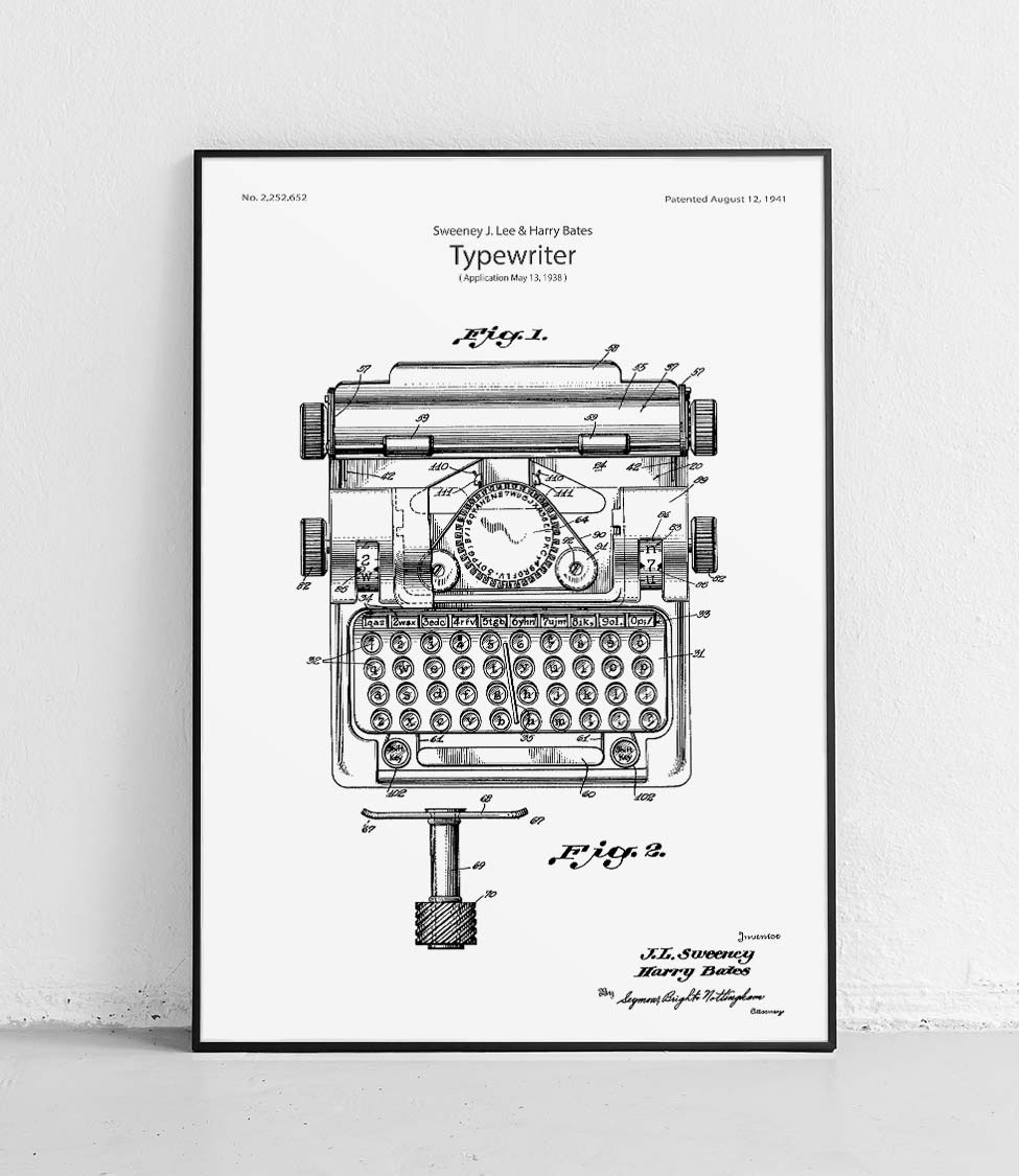 Plakat z reprodukcją patentu przedstawiającego maszynę do pisania autorstwa Sweeney Joseph Lee i Harry Bates.