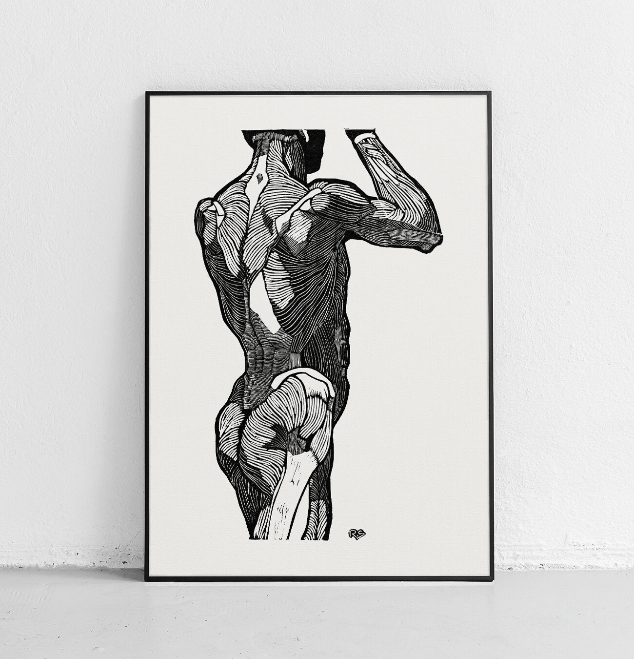 Plakat z reprodukcją ilustracji przedstawia mięśnie pleców mężczyzny. Ilustracja została stworzona przez Reijer Johan Antonie Stolk (1896–1945), holenderskiego artystę.