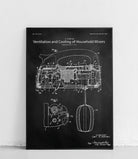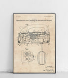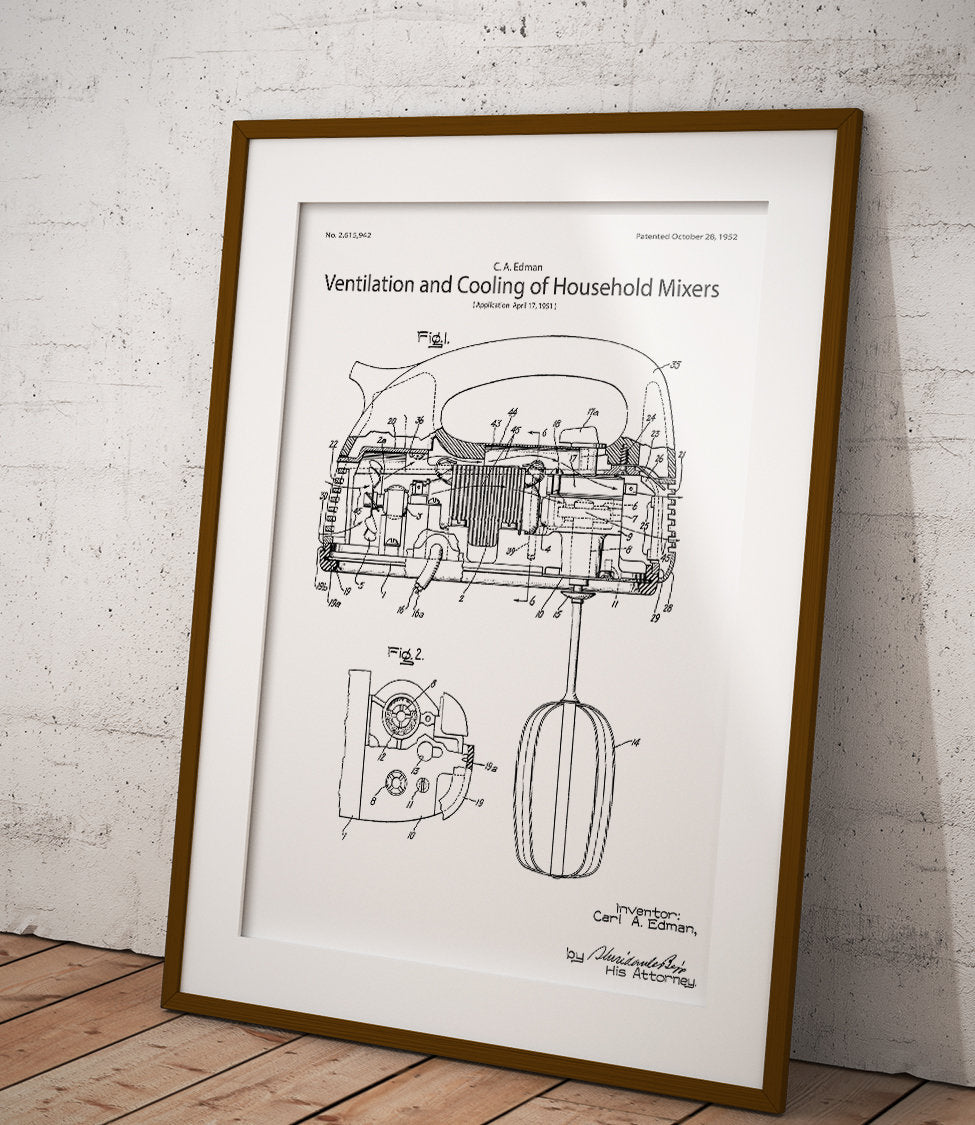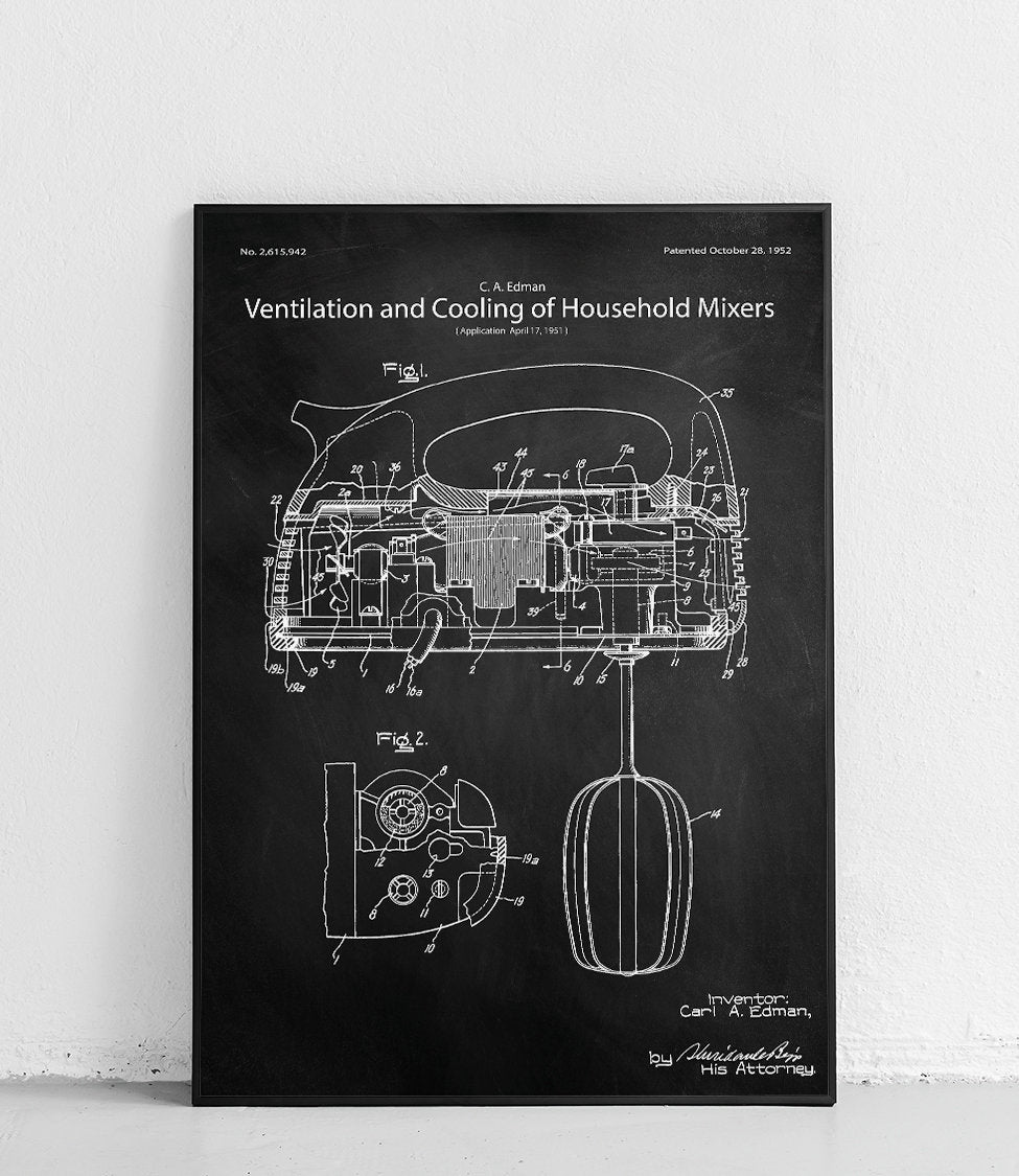 Plakat z reprodukcją patentu przedstawiającego system wentylacji i chłodzenia w mikserze kuchennym, autorstwa Carl'a A. Edman.