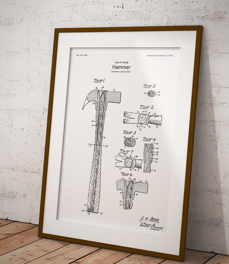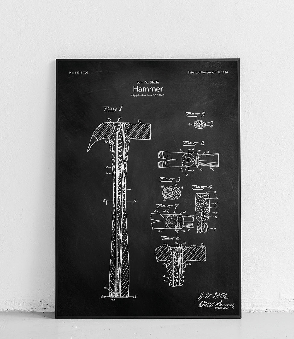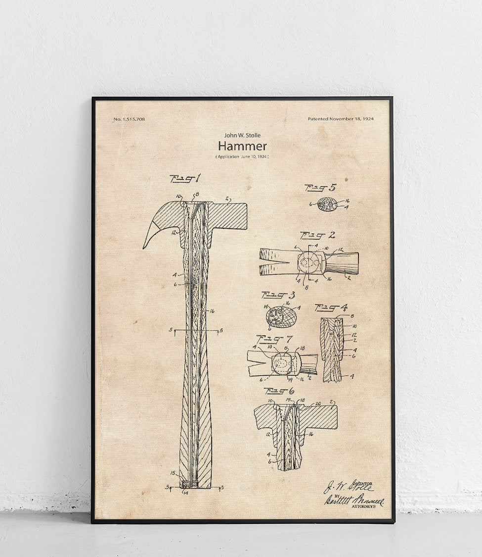 Plakat z reprodukcją patentu przedstawiającego młotek, autorstwa John'a William Stolle.
