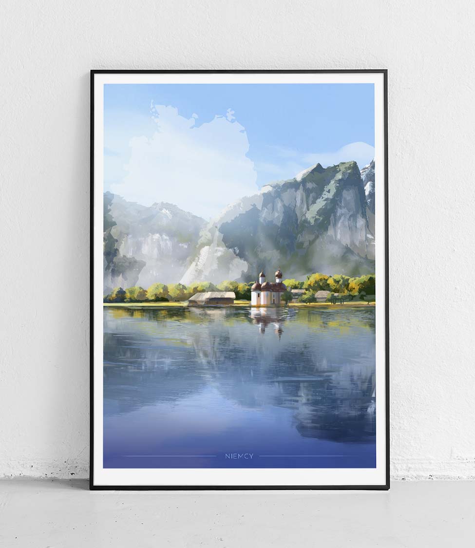 Karolinę Wiśniewską.Ten plakat przedstawia region szczególny, Niemcy. Plakat Niemcy ukazuje przepiękny widok na malowniczo położone jezioro Königssee, uchodzące za najpiękniejsze i najczystsze jezioro alpejskie w Niemczech, jest jedną z najpopularniejszych destynacji turystycznych w Niemczech.