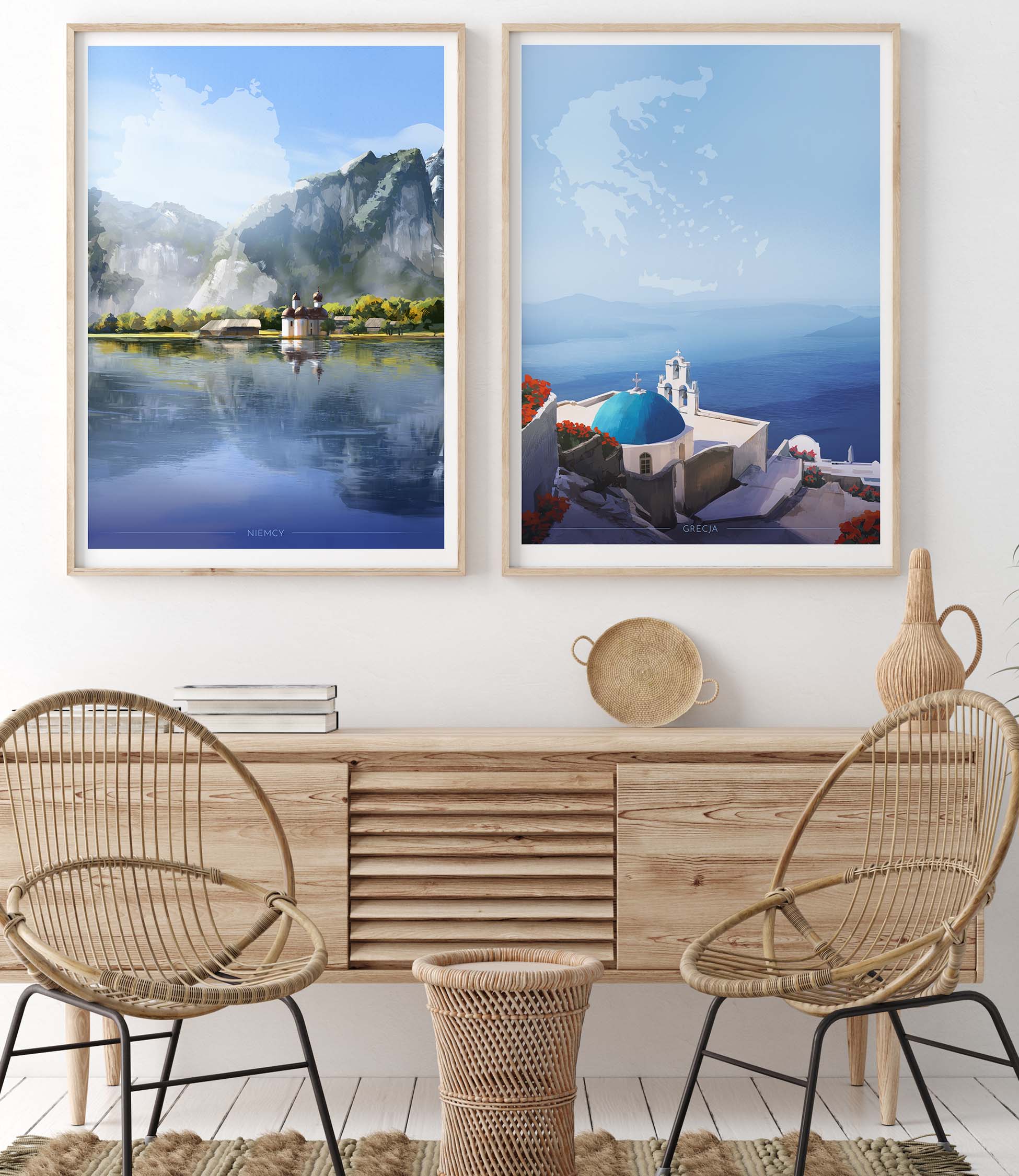 Ten plakat przedstawia region szczególny, Niemcy. Plakat Niemcy ukazuje przepiękny widok na malowniczo położone jezioro Königssee, uchodzące za najpiękniejsze i najczystsze jezioro alpejskie w Niemczech, jest jedną z najpopularniejszych destynacji turystycznych w Niemczech.