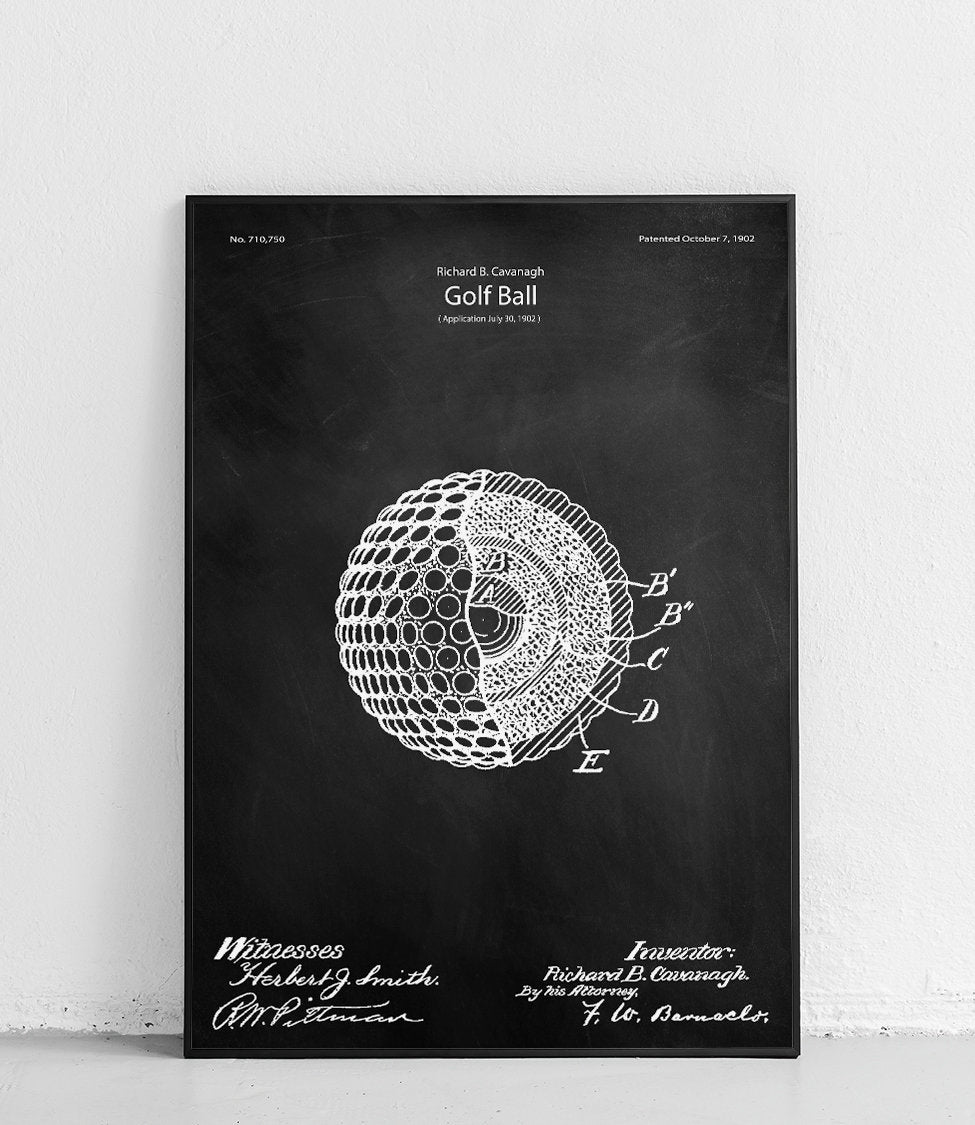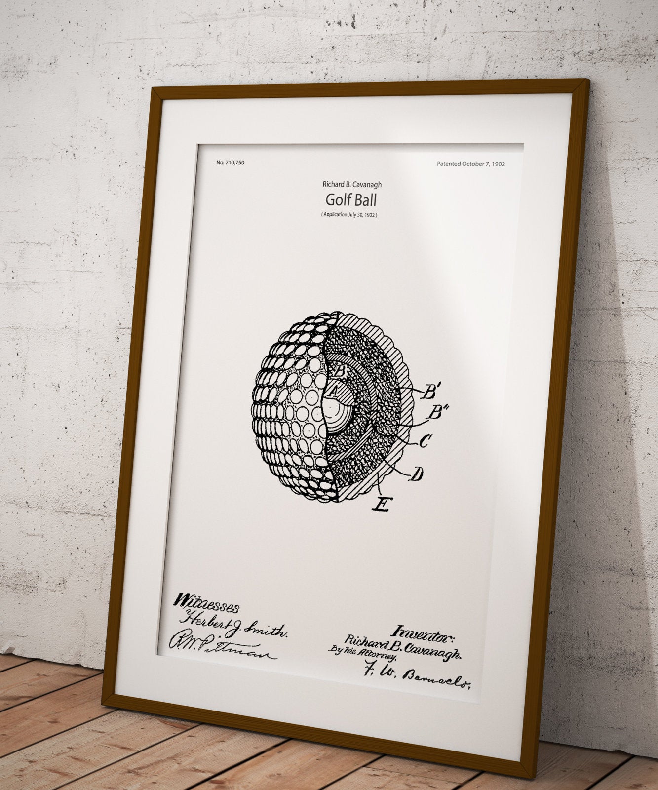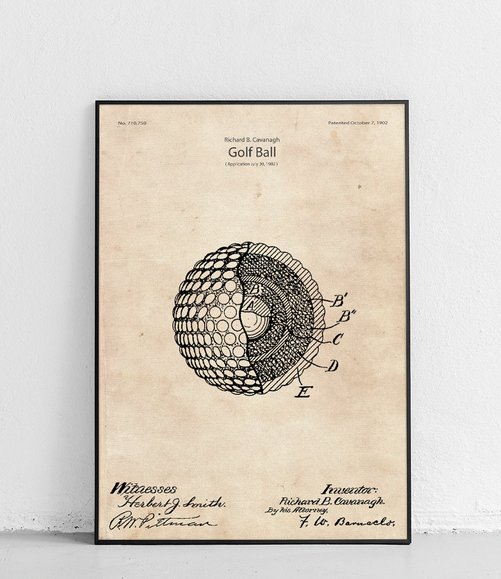 Plakat z reprodukcją patentu przedstawiającego piłka do golfa autorstwa Richard'a B. Cavanagh