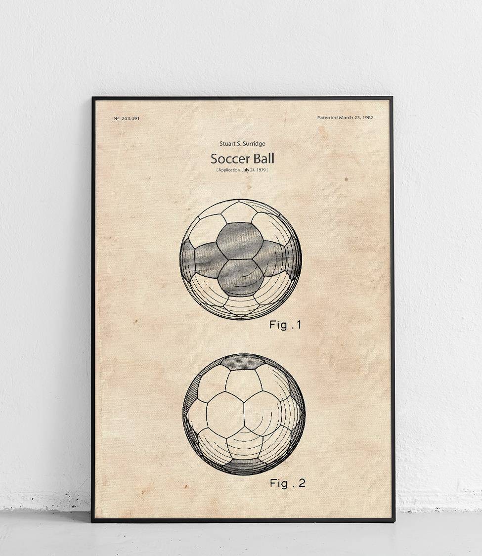 Plakat z reprodukcją patentu przedstawiającego piłkę nożną, autorstwa Stuart'a S. Surridge .