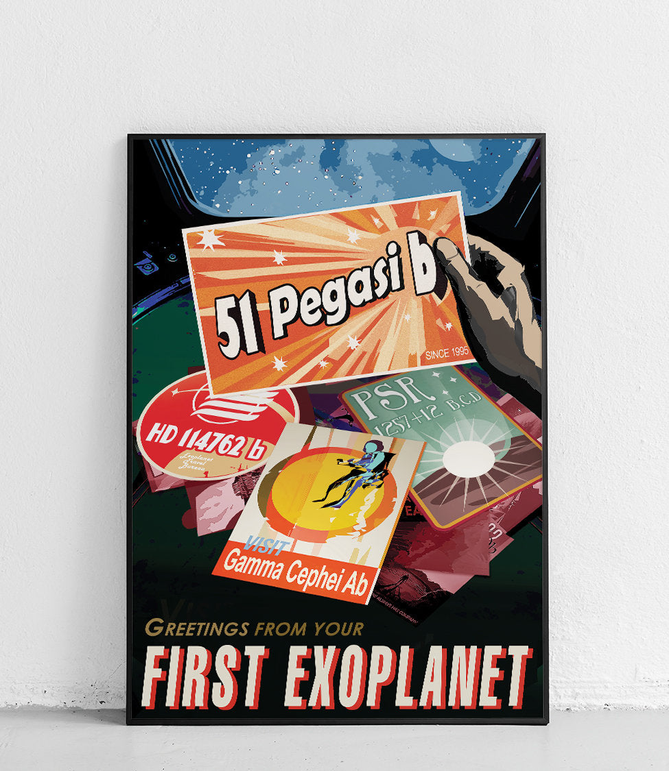 Ten oryginalny plakat pochodzi z serii "Wizje przyszłości" Narodowej Agencji Aeronautyki i Przestrzeni Kosmicznej NASA. Przedstawia wyobrażenie o podróżach kosmicznych i odległych planetach.