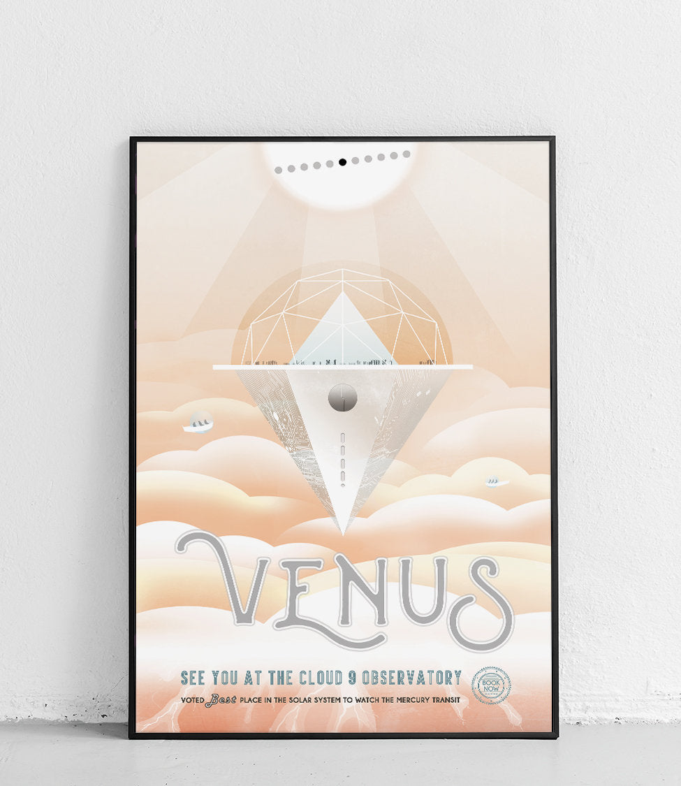 Ten oryginalny plakat pochodzi z serii "Wizje przyszłości" Narodowej Agencji Aeronautyki i Przestrzeni Kosmicznej NASA. Przedstawia wyobrażenie o podróżach kosmicznych i odległych planetach.