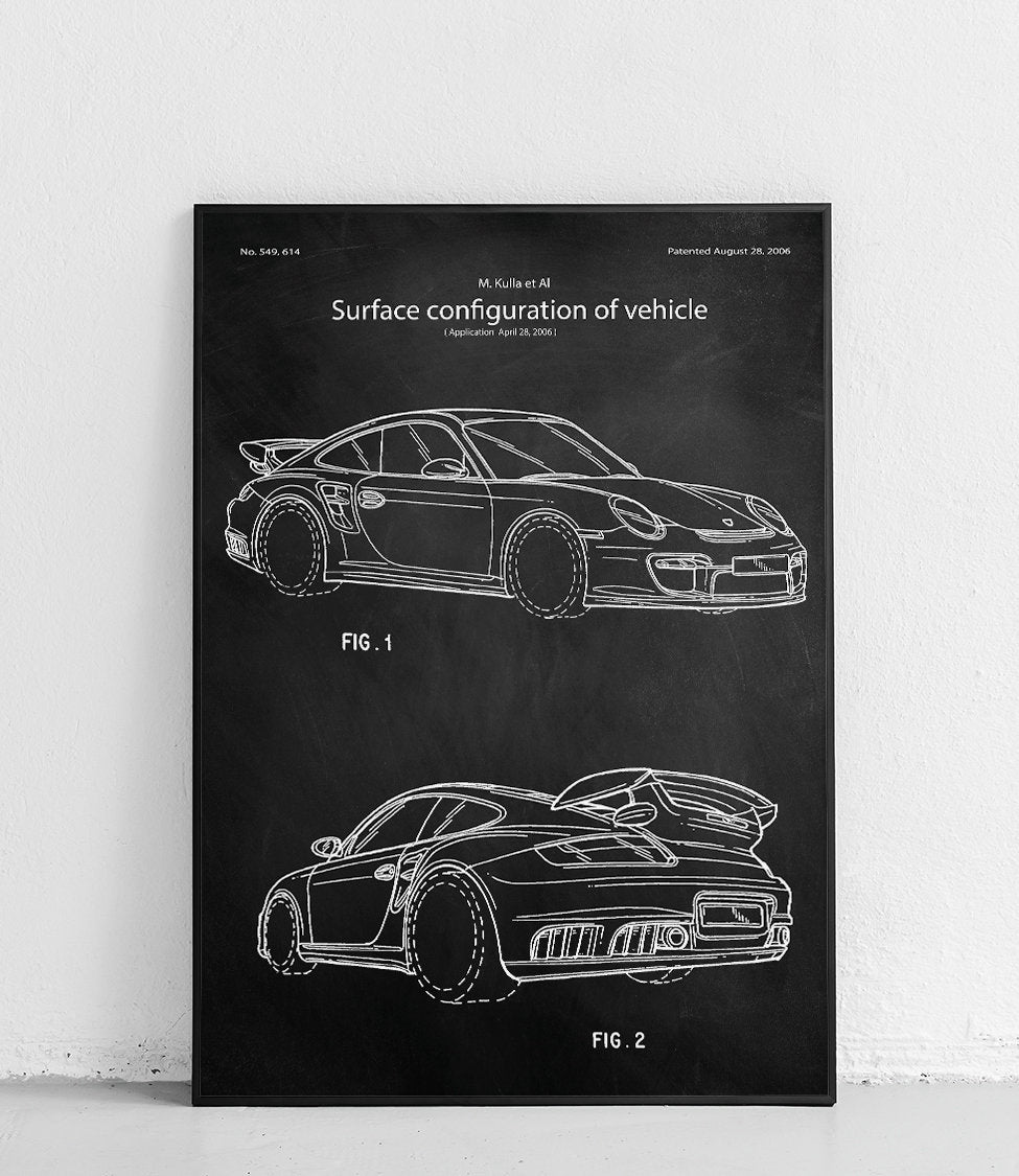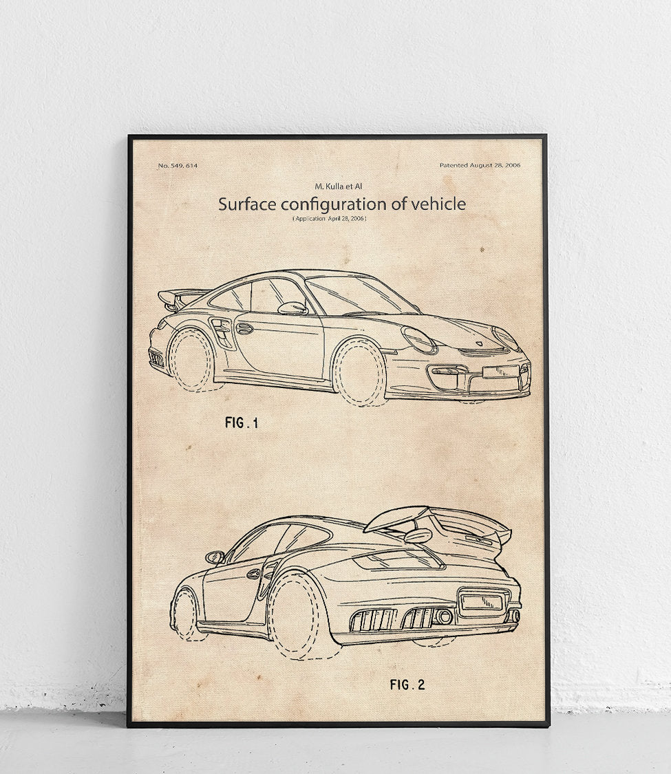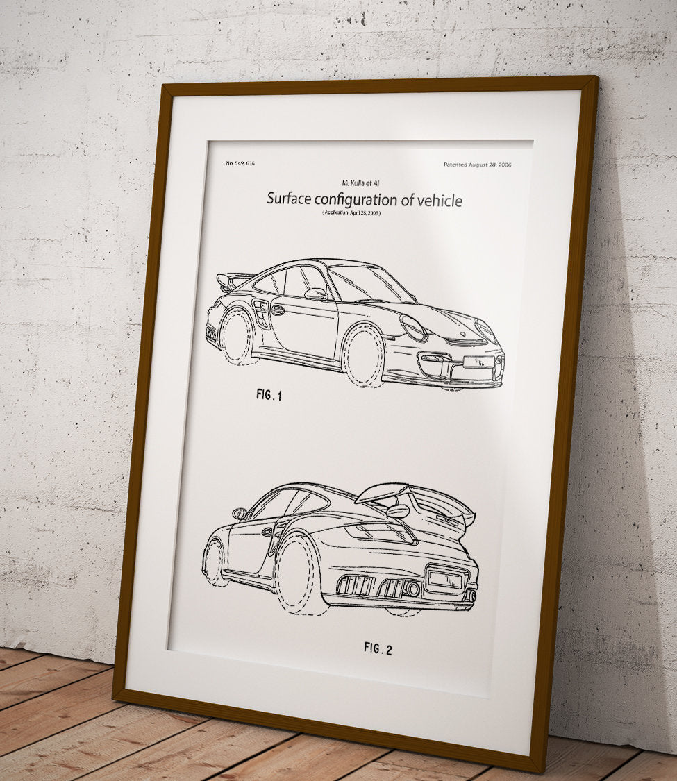 Plakat z reprodukcją patentu samochodu marki Porsche GT2 z 2006 roku autorstwa Matthias'a Kulla, Anthony-Robert'a Hatter i Hakan'a Saracoglu.