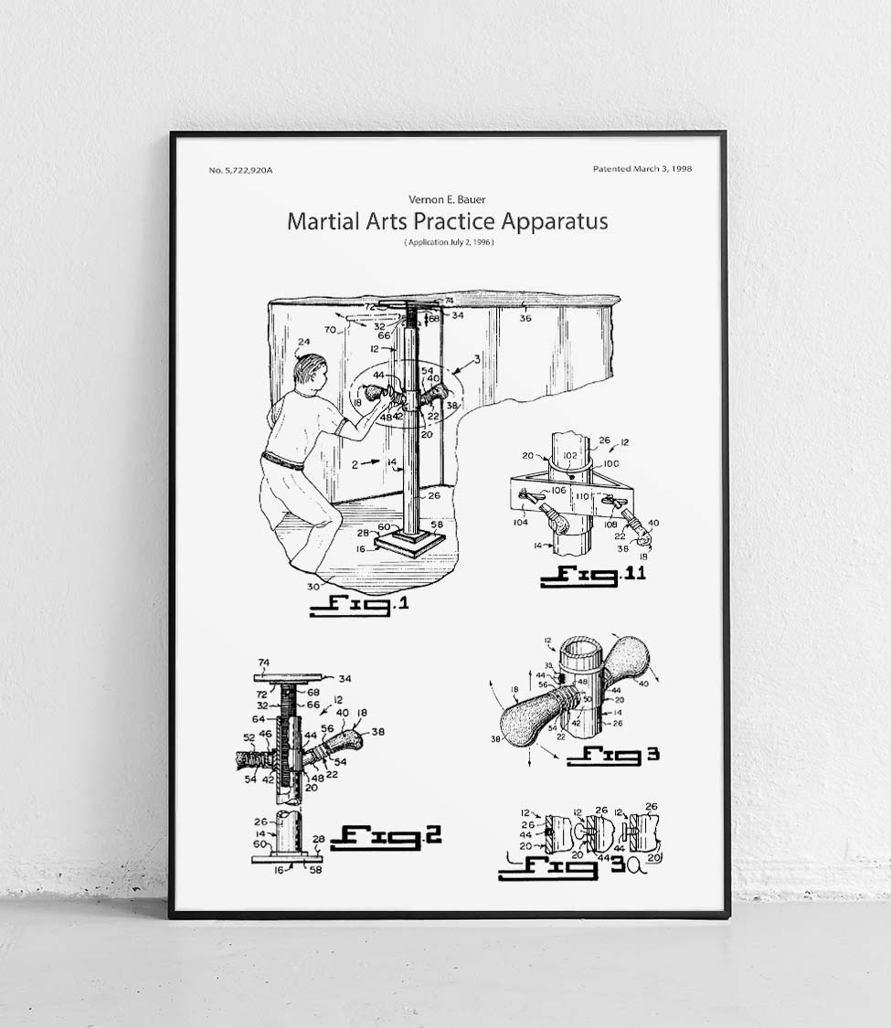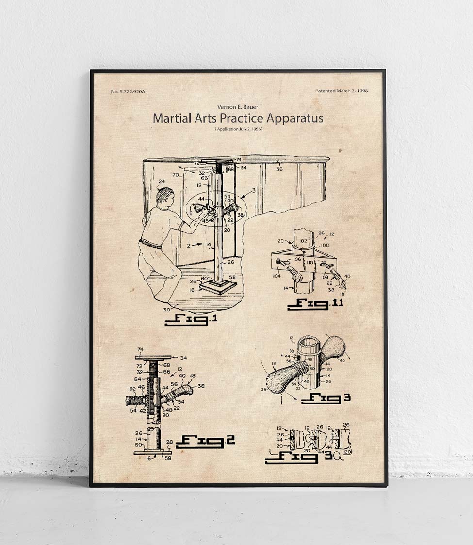 Plakat z reprodukcją patentu przedstawiającego przyrząd do ćwiczeń sztuk walki, autorstwa Vernon E. Bauer.