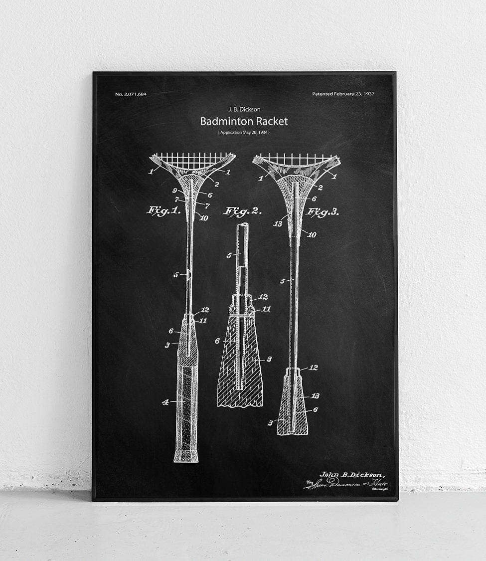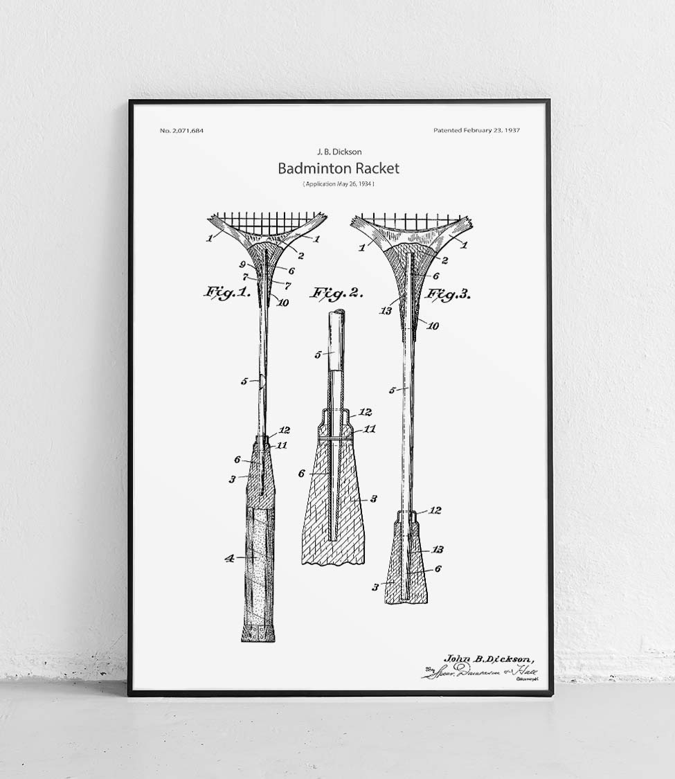 Plakat z reprodukcją patentu przedstawiającego rakietę do badmintona autorstwa John'a B. Dickson.