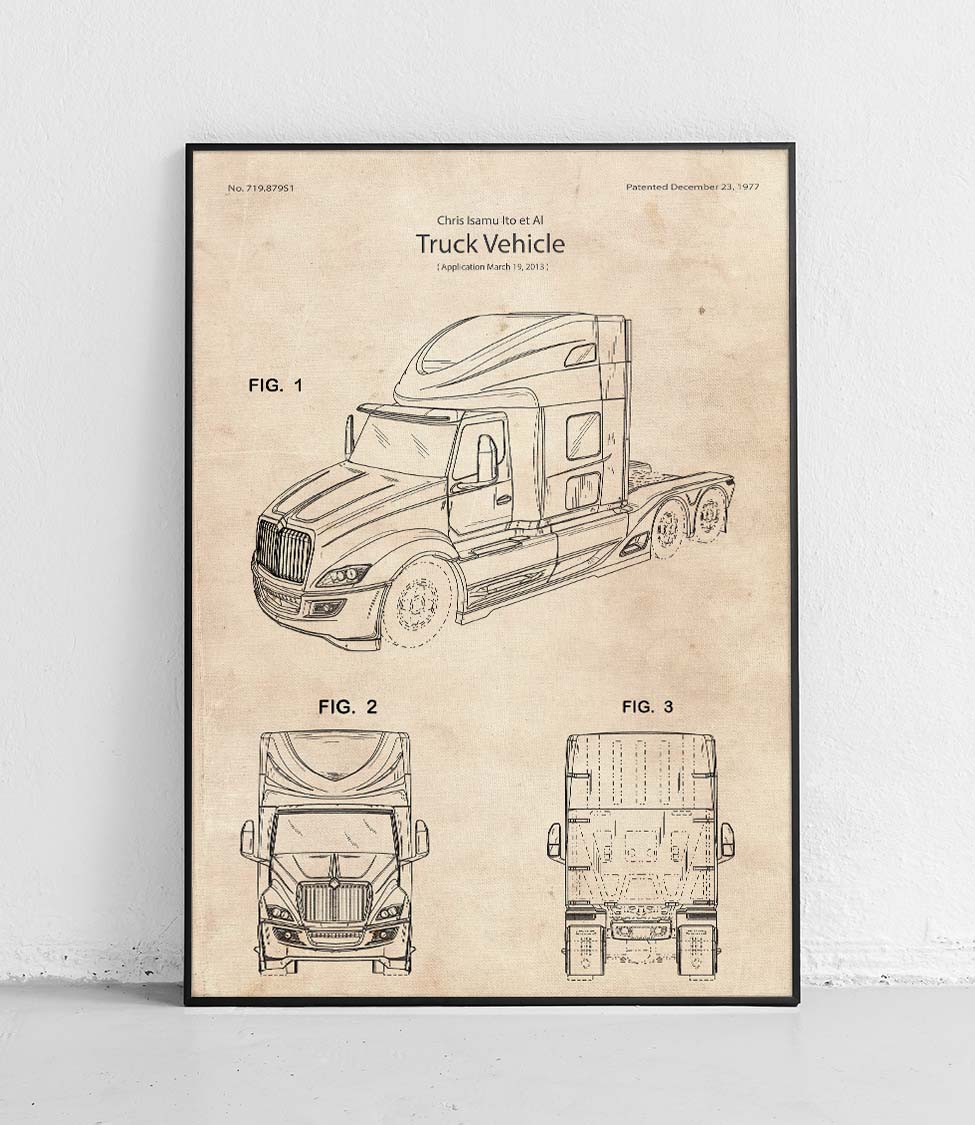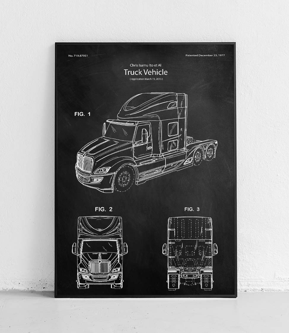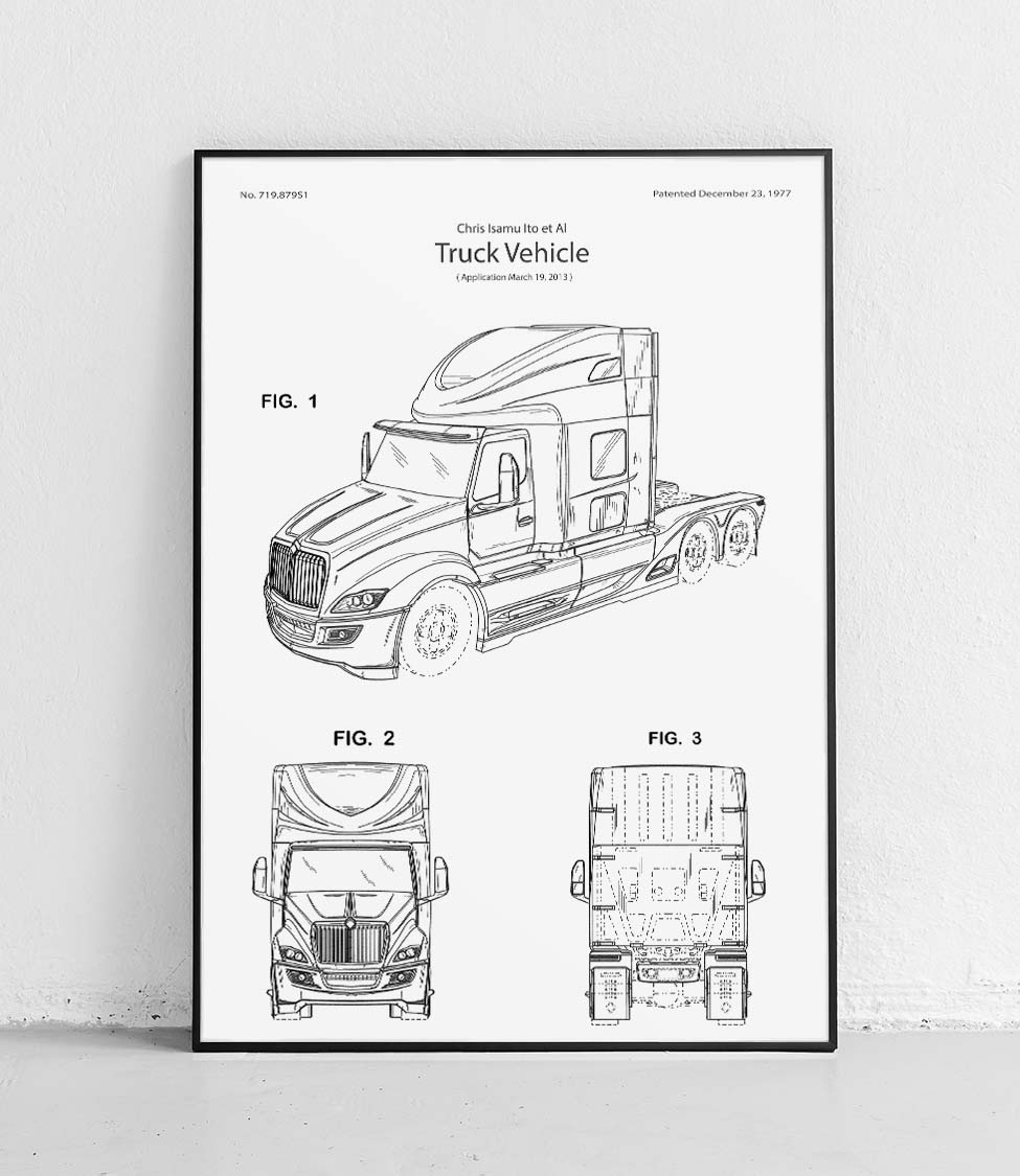 Plakat z reprodukcją patentu przedstawiającego samochód ciężarowy, autorstwa Chris Isamu Ito, Glen Joel Durmisevich, John Song, Christian Michael Hardin, David James Olsen, Jonathan Allen Wicks, Charles Kent Booker, James C. Box, Curtis Lawrence Wilson, Robert Paul Scott, Benjamin Anthony Kuzmicz, Rudolf David Gonzalez, Patrick James Quinn, James Leroy Smith, Jr.