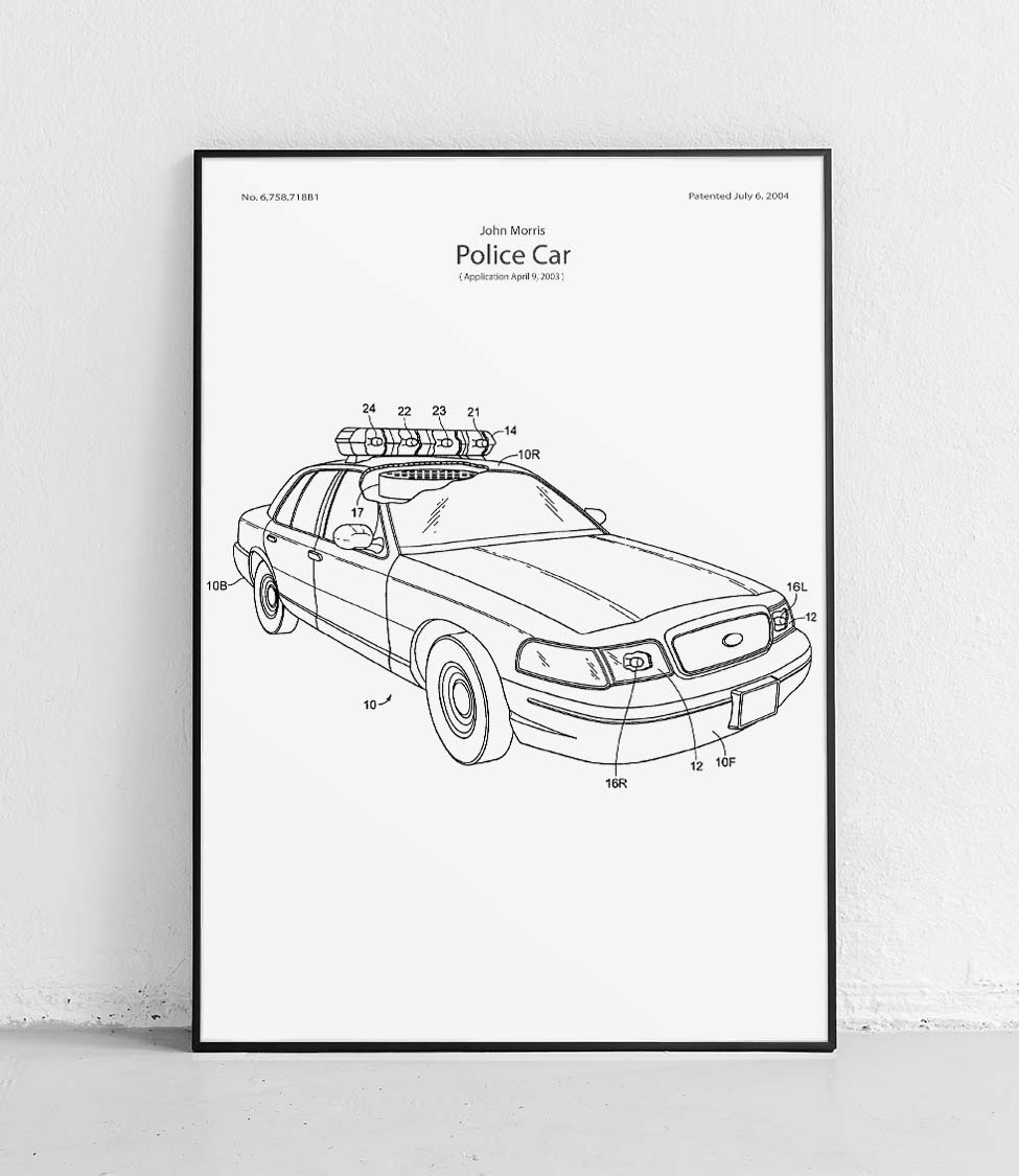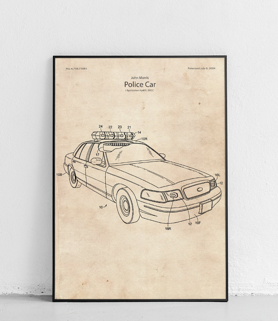 Plakat z reprodukcją patentu przedstawiającego samochód policyjny - zabawka z realistycznym wyświetlaczem świetlnym i dźwiękowym.