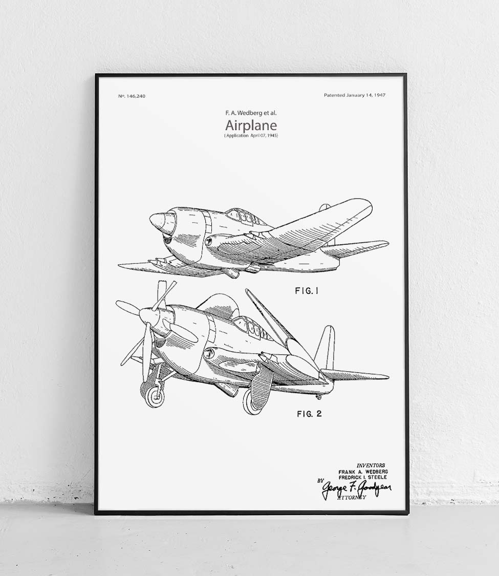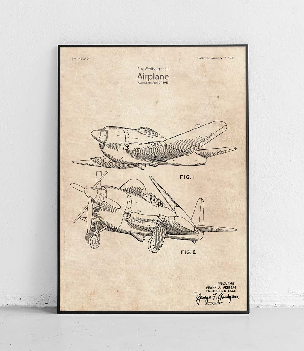 Plakat z reprodukcją patentu przedstawiającego amerykański samolot myśliwski autorstwa Frank'a A. Wedberg i Frederick'a I. Steele.