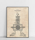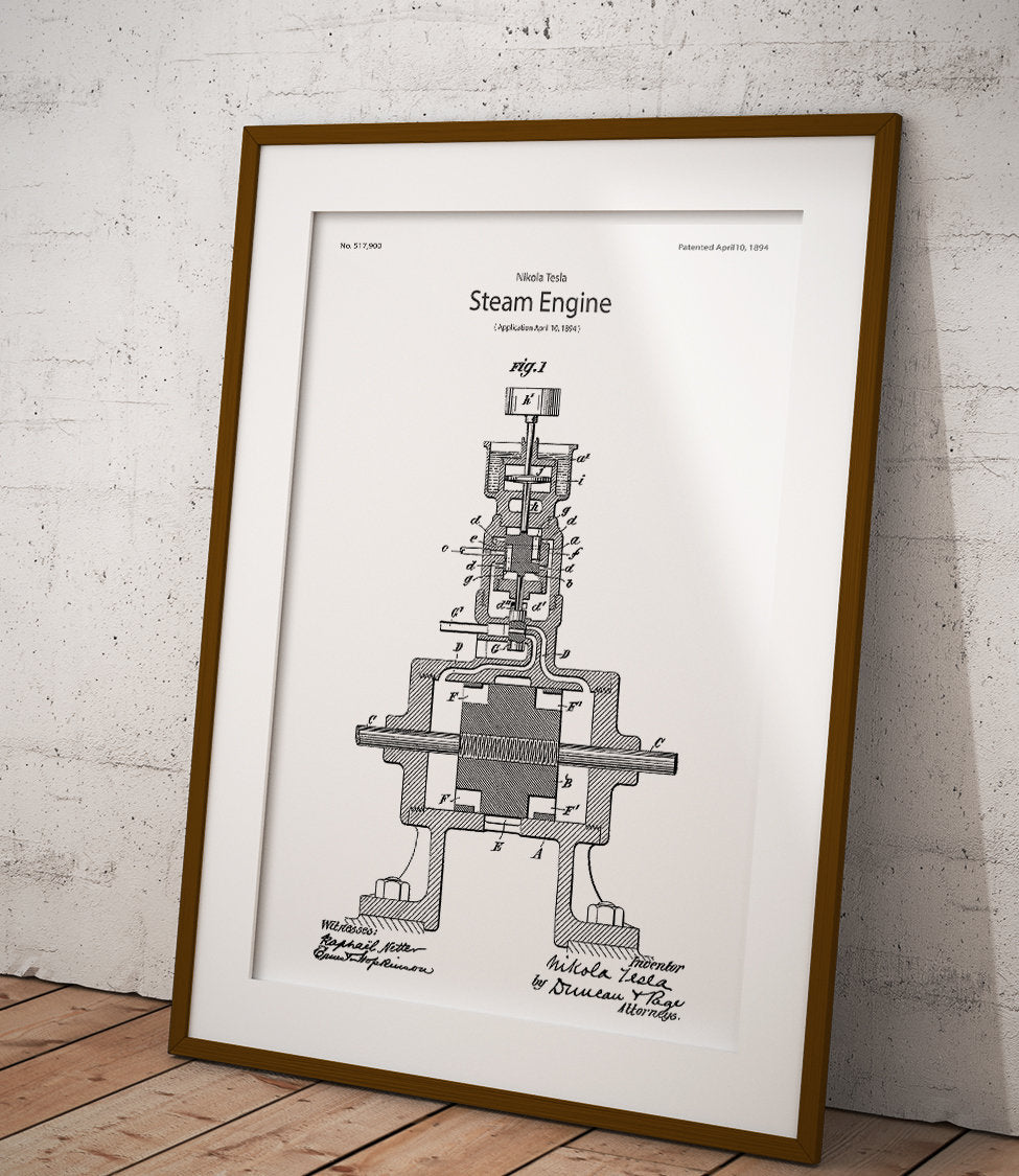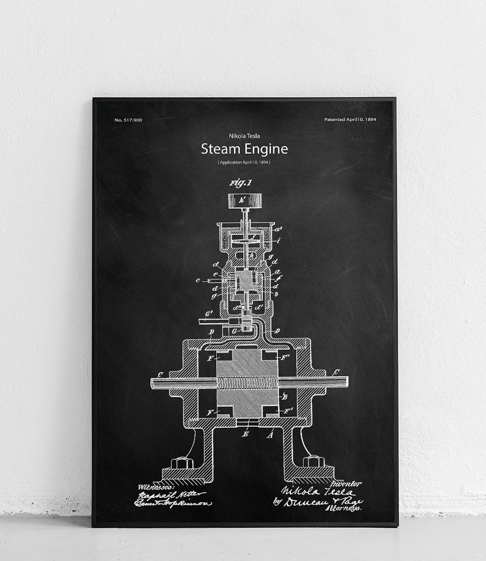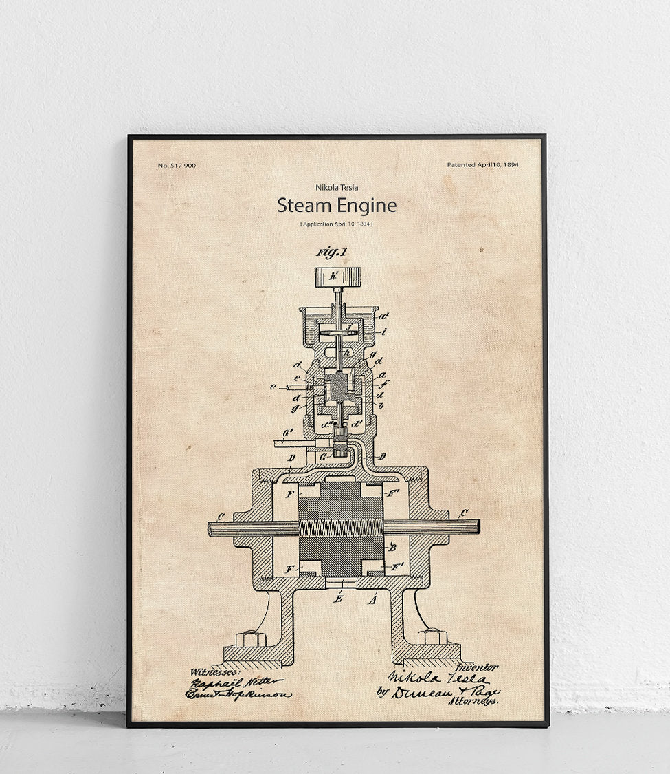 Plakat z reprodukcją patentu przedstawiającego silnik parowy, autorstwa Nikola Tesli.