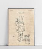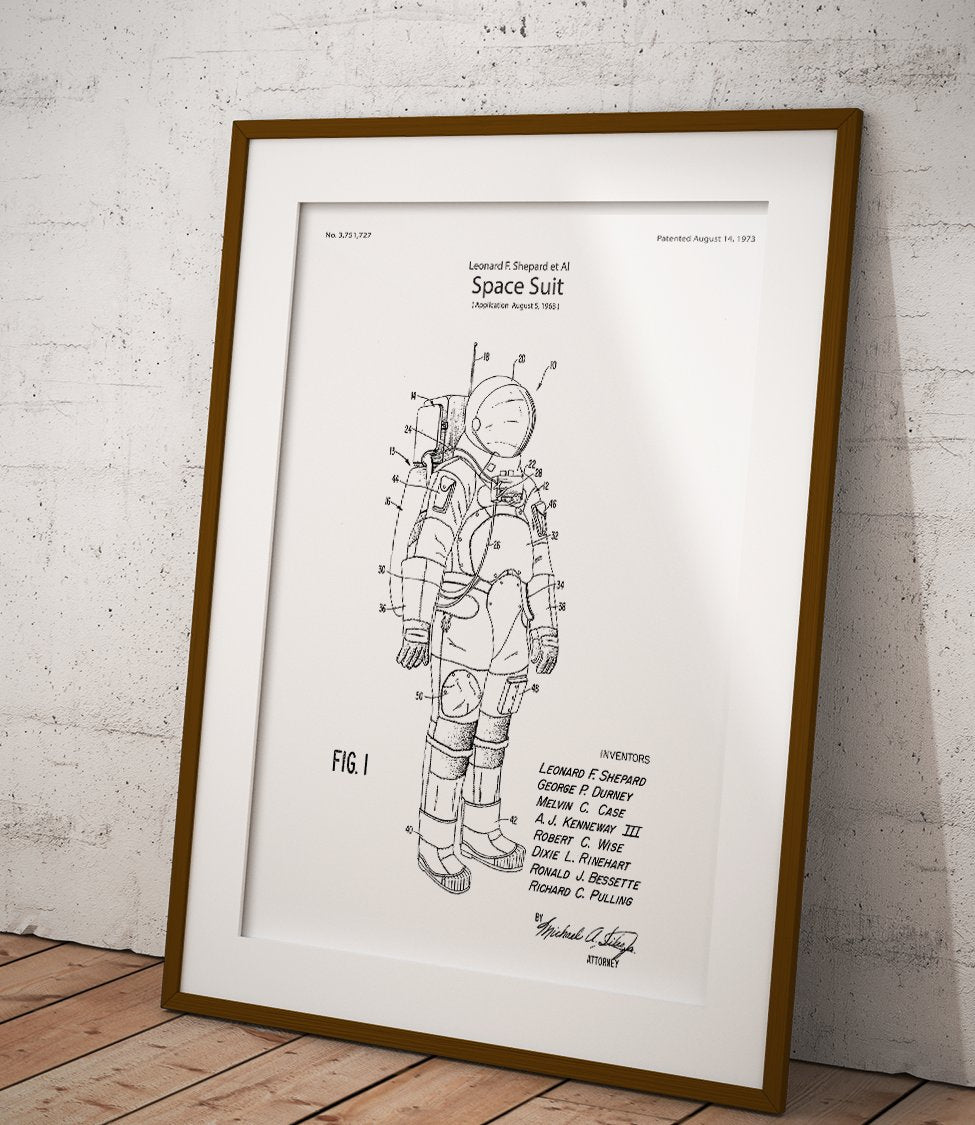 Plakat z reprodukcją patentu skafandra kosmicznego Amerykańskiej Agencji NASA autorstwa L. Shepard, G. Durney, M Case, R. Pulling, D. Rinehart, R. Bessette, A Kenneway i R. Wise .