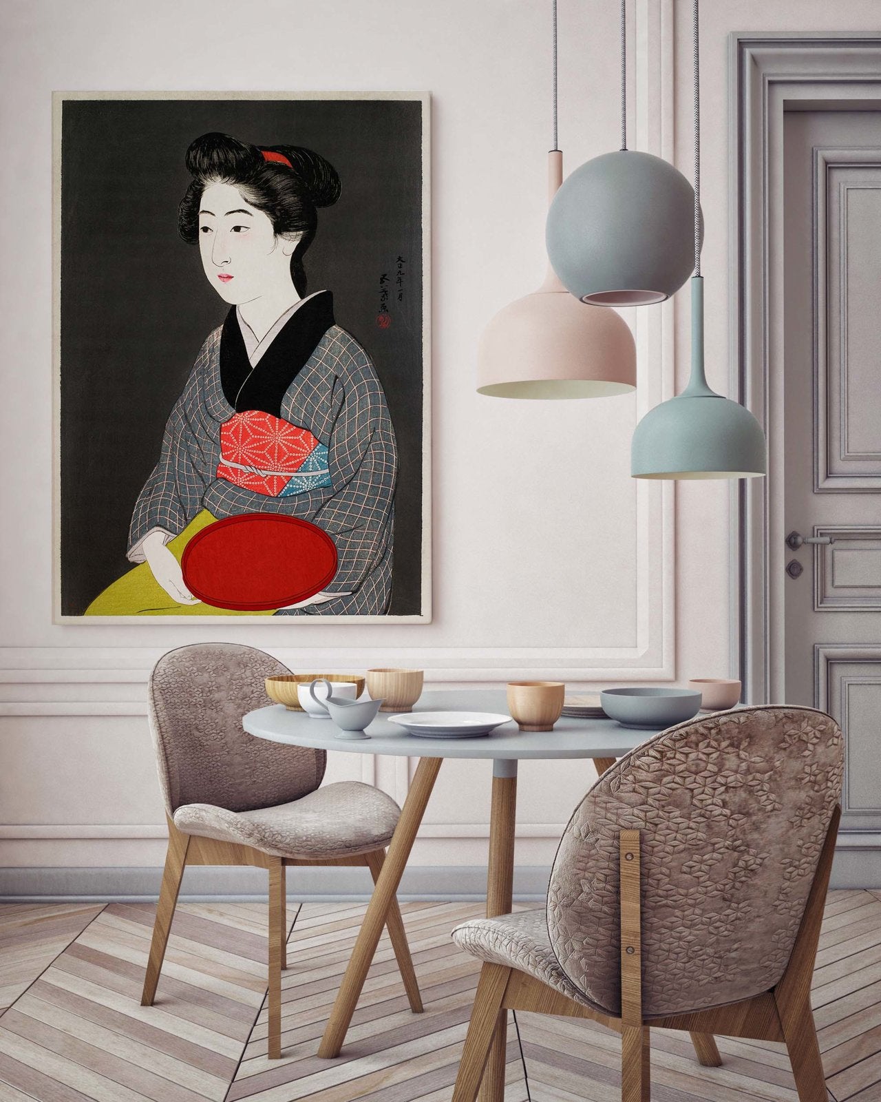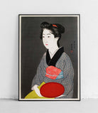 Ilustracja "Służąca z tacą" wykonana przez Goyō Hashiguchi, japońskiego artystę. Stał na czele ruchu shin-hanga, odrodzenia ukiyo-e, zaprojektował czternaście odbitek drzeworytniczych, które są uważane za arcydzieła tego gatunku.