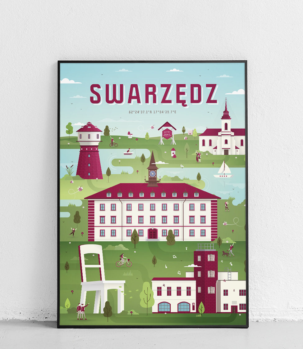 to duet niebieskiej tafli wody i nieba oraz barw ziemi i piasku. Swarzędz z plakatu słynie ze swojej archeologicznej historii i wykopalisk. Uwagę na posterze miasta przykuwa także krzesło. Swarzędz jest znany ze swojej fabryki mebli.Plakat ze Swarzędzem doskonale uzupełni zbiór miejskich krajobrazów w każdym domu.