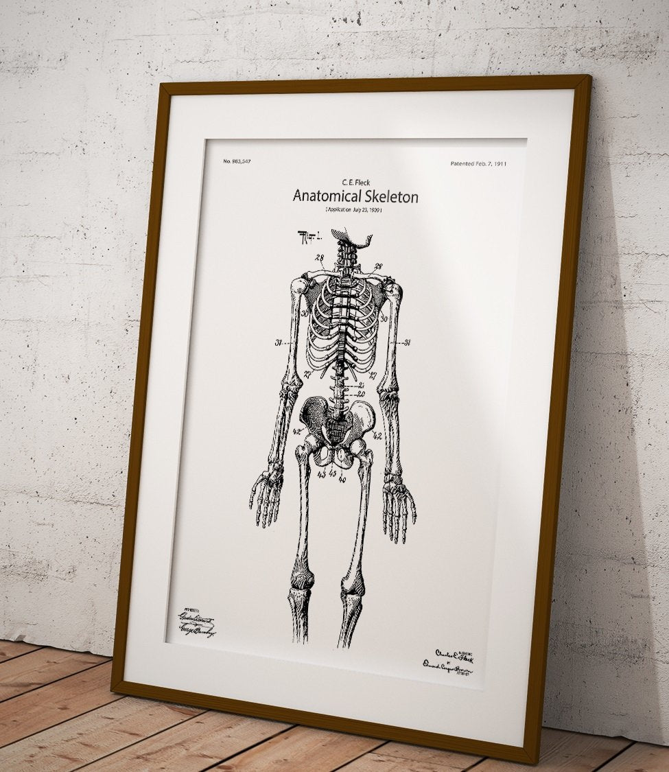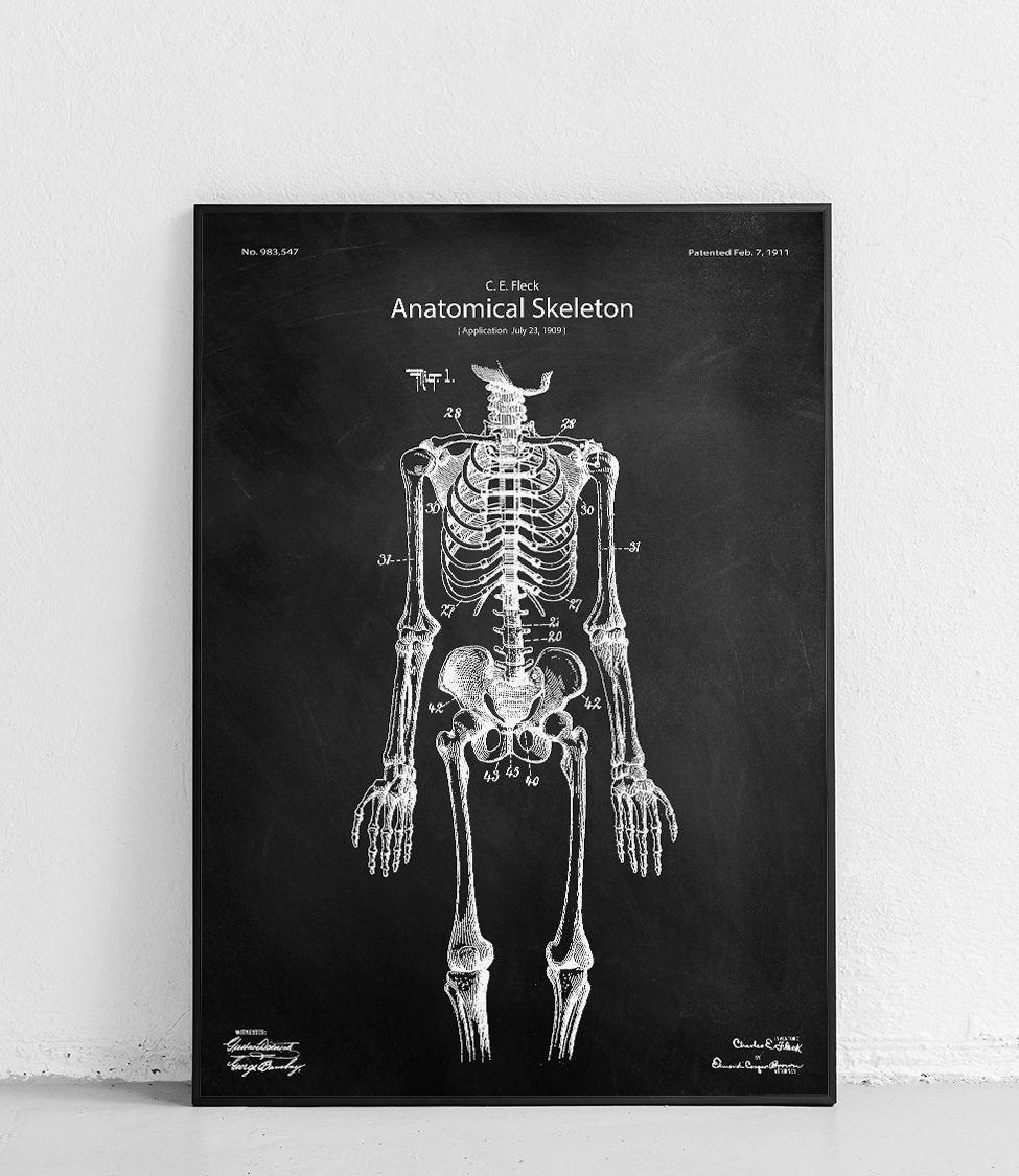 Plakat szkielet człowieka to opatentowana reprodukcja modelu ludzkiego szkieletu z 1909 roku autorstwa Charlesa E. Flecka.