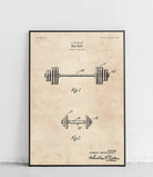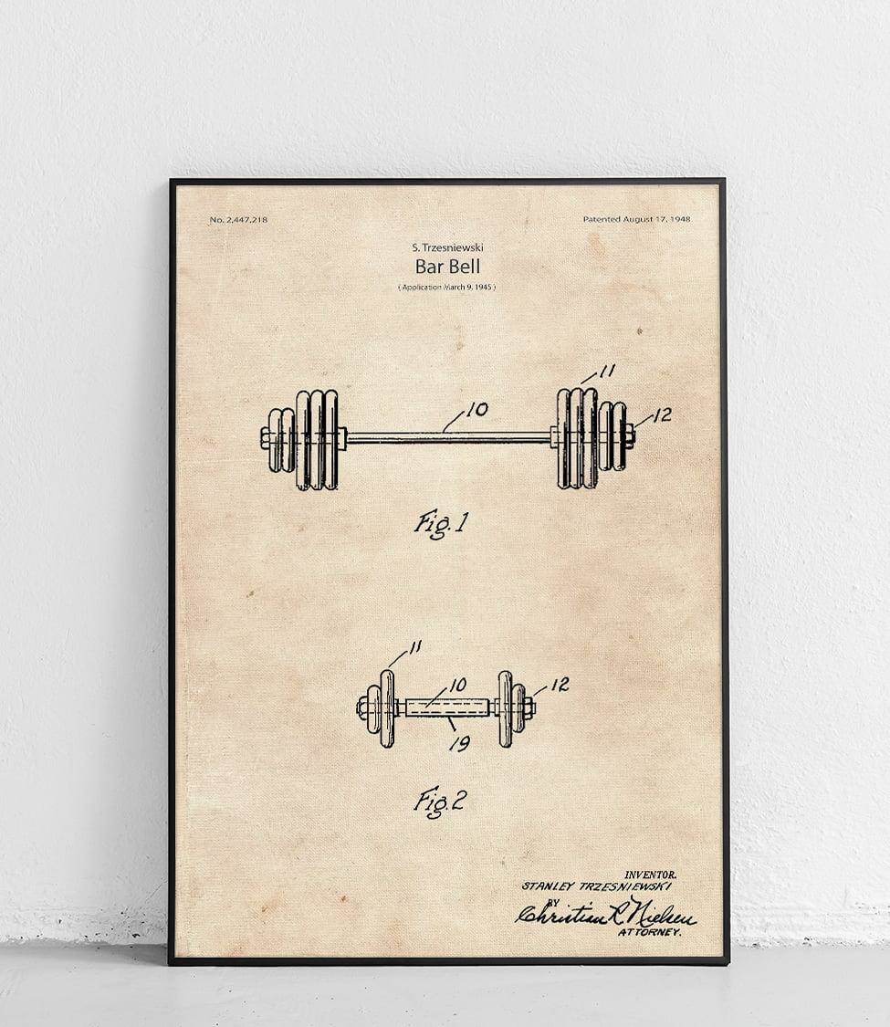 Plakat z reprodukcją patentu przedstawiającego sztangę autorstwa Stanley'a Trzesniewski.