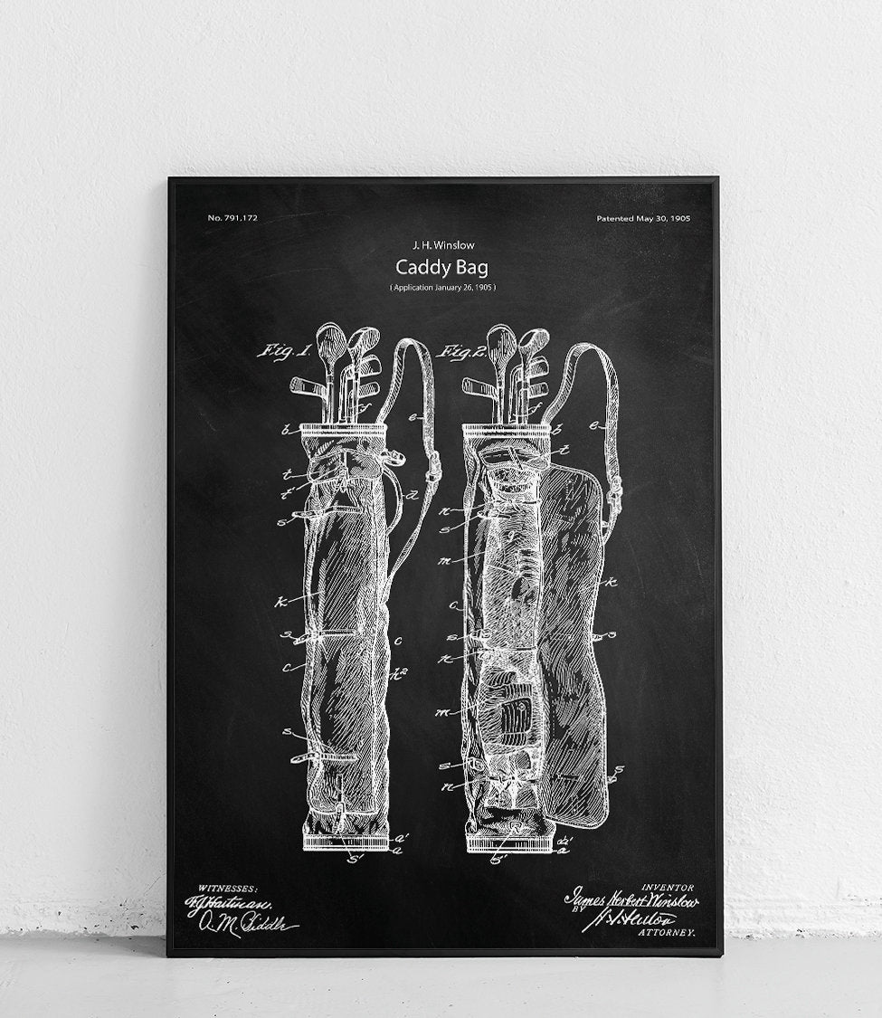 Plakat z reprodukcją patentu przedstawiającego torbę na kije do golfa autorstwa James Herbert Winslow.