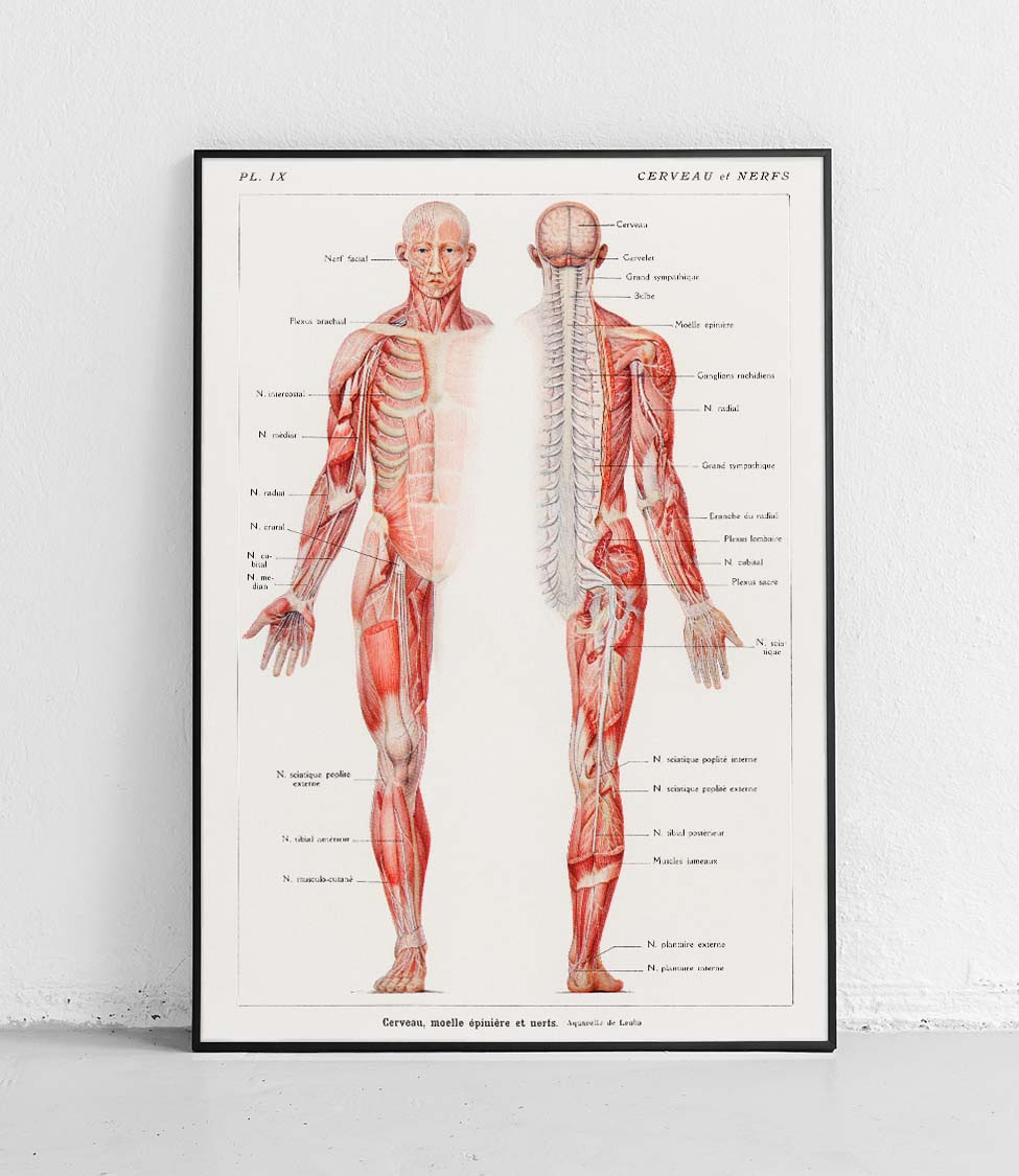 Plakat z reprodukcją ilustracji przedstawiającej układ nerwowy człowieka wykonanej w 1912 roku. Autorem ilustracji jest Galtier-Boissière i Émile.