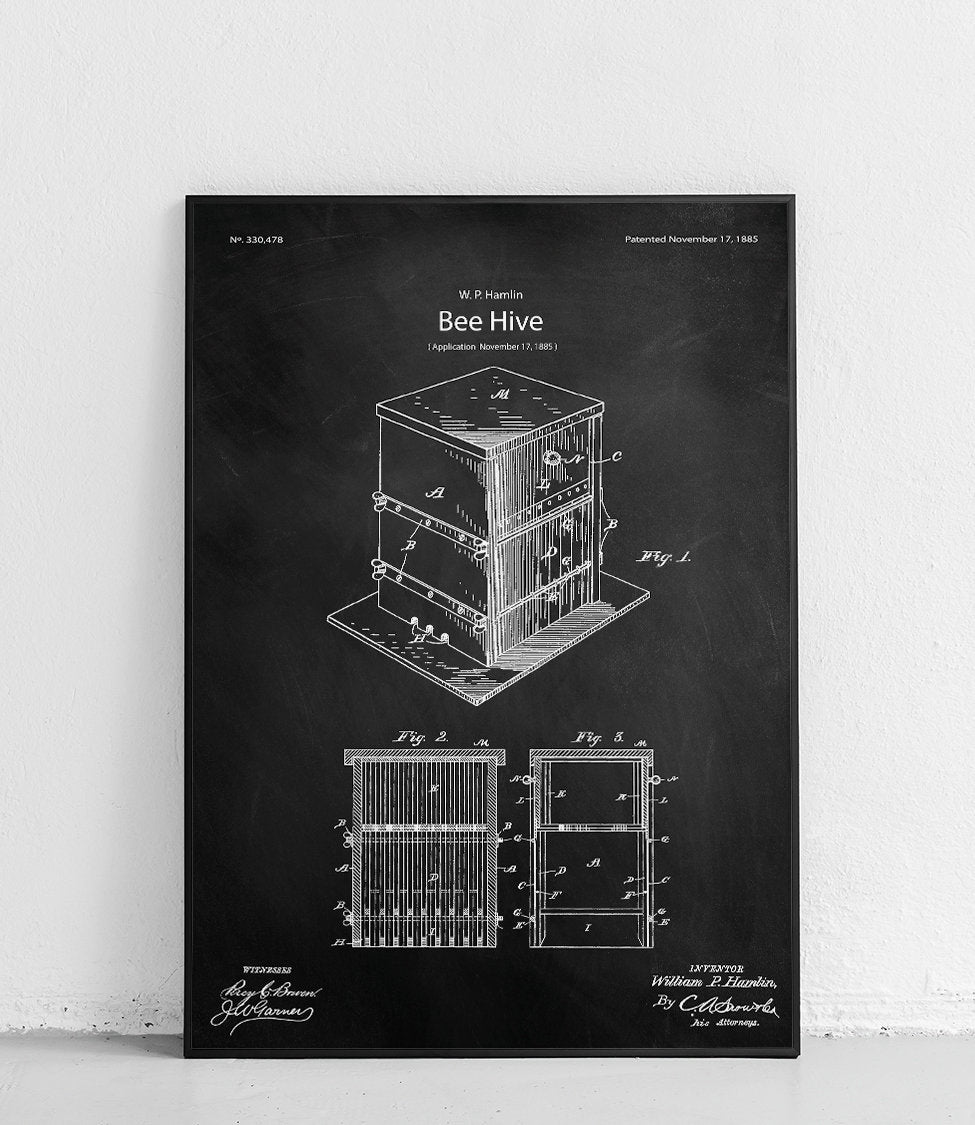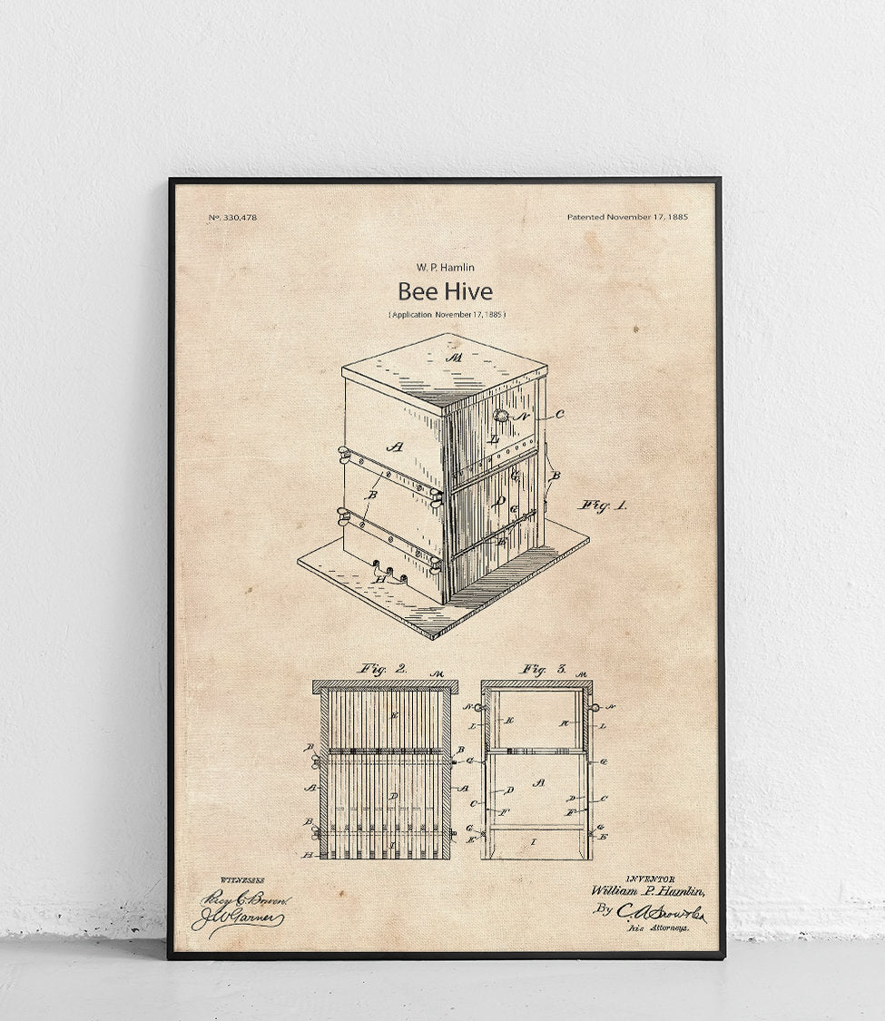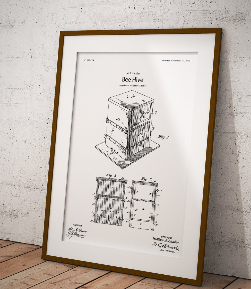 Plakat z reprodukcją patentu przedstawiającego ulepszenia w konstrukcji ula, autorstwa William'a P. Hamlin.