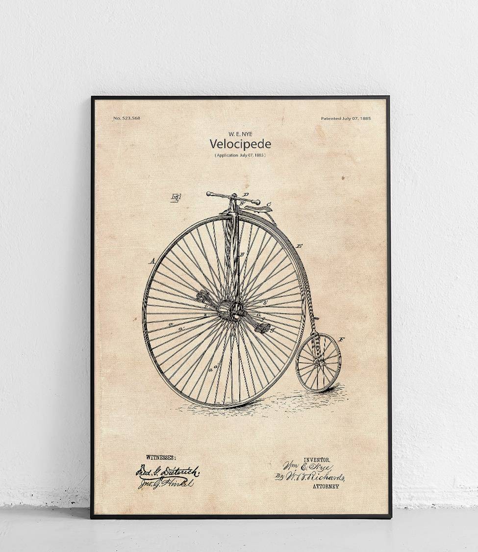Plakat z reprodukcją patentu przedstawiającego welocyped tj. pierwotny rower nieposiadający łańcucha ani hamulców.