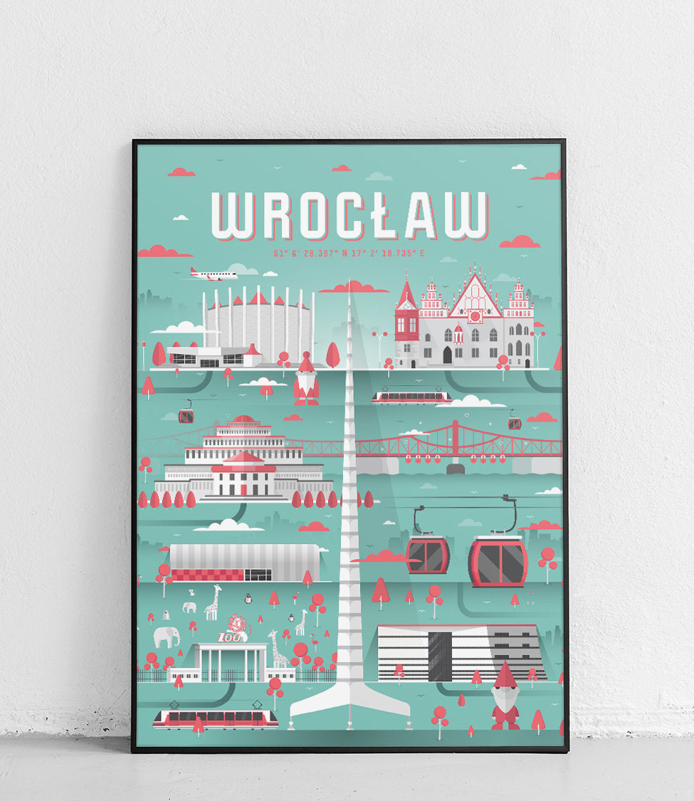 Plakat z serii “Miasta” przedstawia największe symbole Wrocławia tj.: