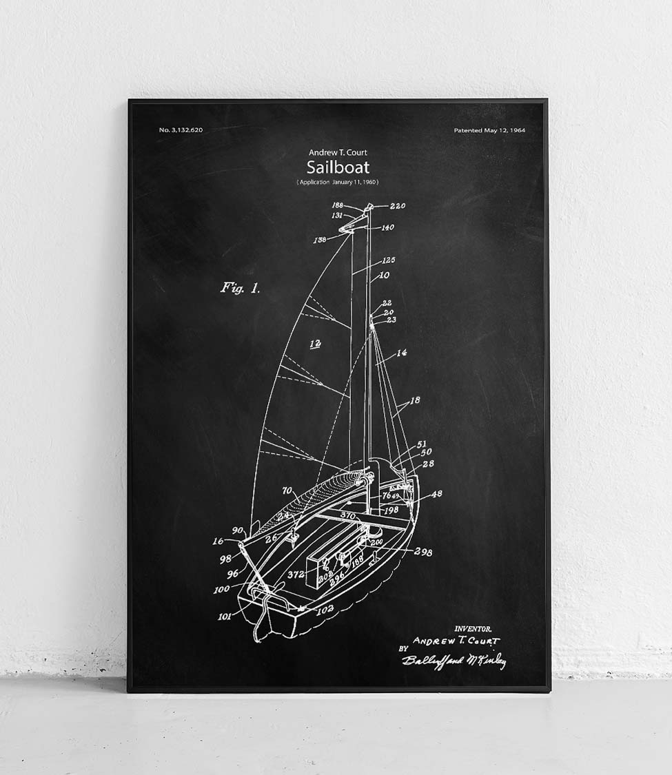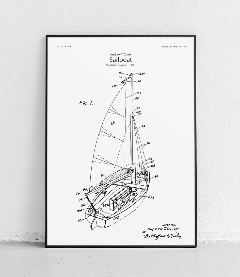 Plakat z reprodukcją patentu przedstawiającego żaglówkę autorstwa Andrew'a T. Court .
