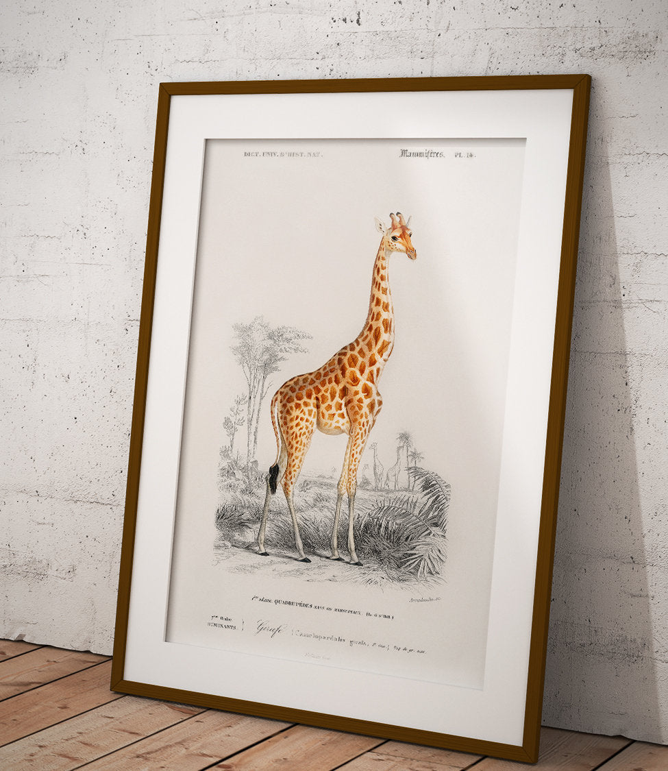 Plakat żyrafa to oryginalna ilustracja z serii "Zwierzęta" została wykonana na zlecenie Słownika Powszechnego Historii Naturalnej przez francuskiego botanika i geologa Charles Henry Dessalines d’Orbigny, żyjącego w latach 1806-1876. Załączona grafika przedstawia żyrafę (Giraffa camelopardalis).